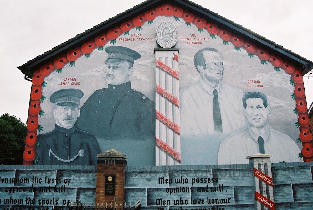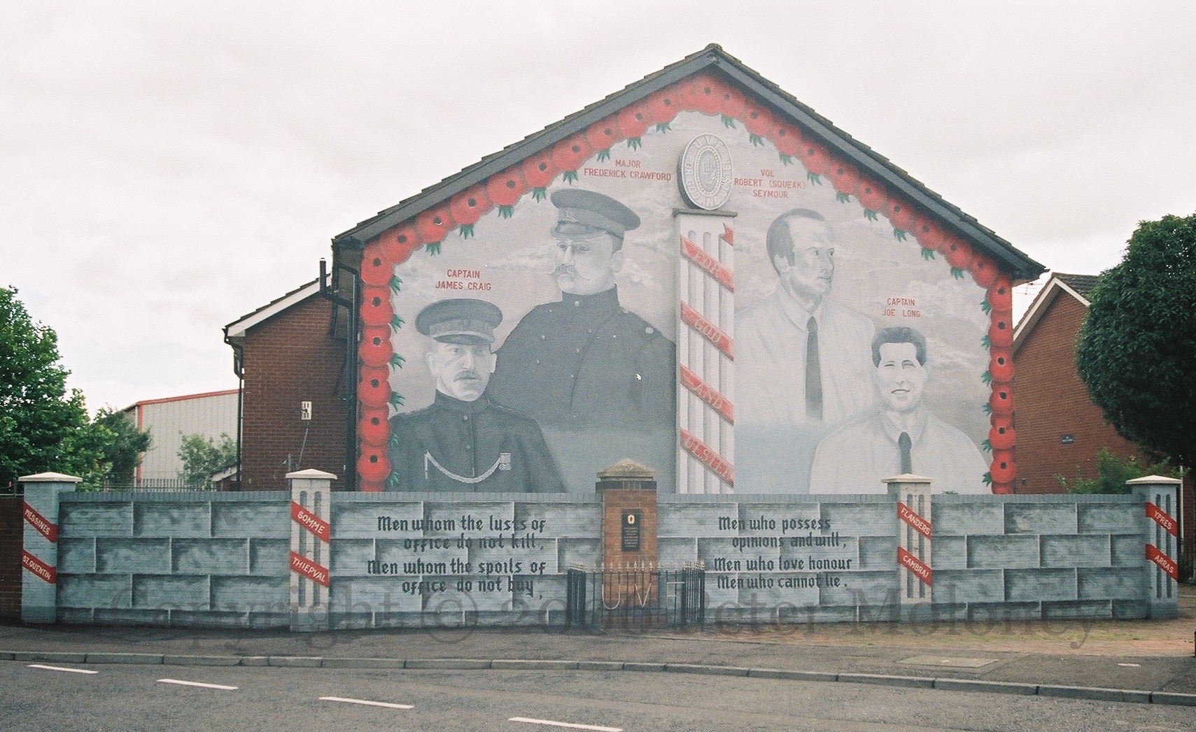 The men on the left of the mural are Captain James Craig (who fought in the Second Boer War before becoming a unionist leader, organiser of the the Ulster Volunteers, and first Prime Minister Of Northern Ireland) and Major Frederick Crawford, who fought in both Boer Wars and organised the Larne gunrunning.