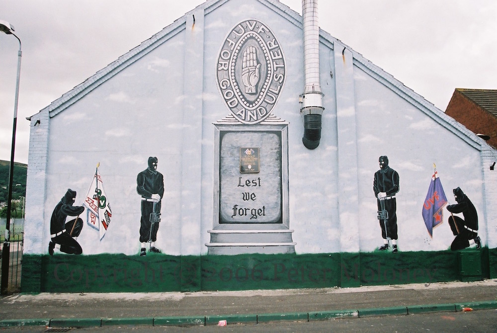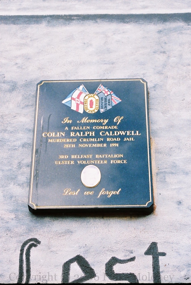 “In memory of a fallen comrade, Colin Ralph Caldwell, murdered, Crumlin Road jail, 28th November 1991. 3rd Belfast battalion, Ulster Volunteer Force. Lest we forget.” The bomb had been planted by the IRA, killing the UDA’s Robert Skey immediately (November 24th) and Caldwell, from his wounds, a few days later on the 28th. A flute band was named in Caldwell’s memory and had a board across the street: Colin Caldwell Memorial FB.