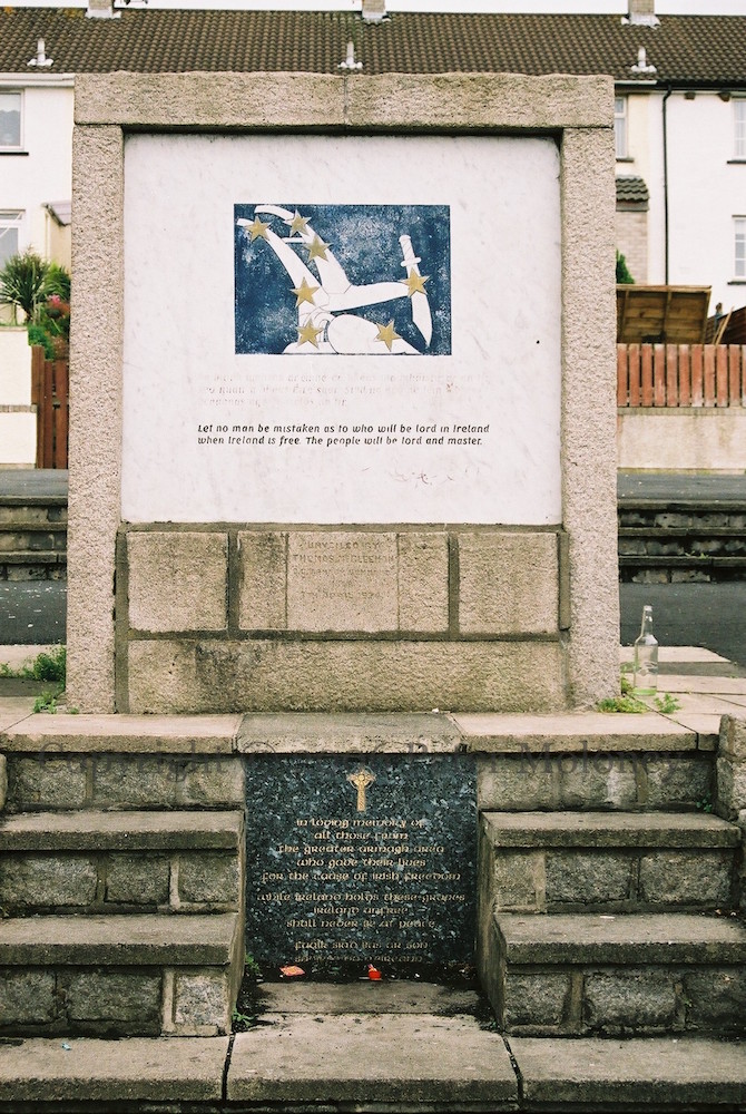 “Na bíodh amhras ar éınne cé bhéas ına mháıstır ar an tír seo nuaır a bhéas Éıre saor. ‘Sıad na daoıne féın a bhéas ı gceannas agus a rıalós [ = rıalú ?] an tír.” is a translation of a line from Padraig Pearse’s The Sovereign People: “Let no man be mistaken as to who will be lord in Ireland when Ireland is free. The people will be lord and master”. “Unveiled by Thomas McGleenan, OC Armagh Command, IRA, 7th April 1974” (close-up at CAIN).