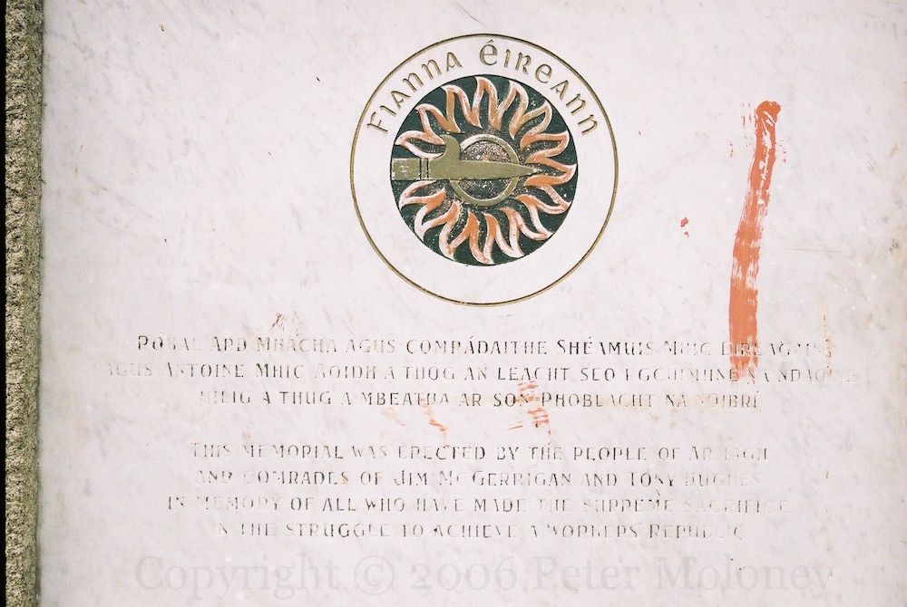 “Pobal Ard Mhacha agus comprádaithe Shéamus Mhic Eireagain agus Antoine Mhic Aoidh a thóg an leacht seo i gcuimhne na ndaoine uilig a thug a mbeatha ar son phoblacht na noibrí.” “This memorial was erected by the people of Armagh and comrades of Jim McGerrigan an Tony Hughes in memory of all who have made the supreme sacrifice in the struggle to achieve a workers republic.”