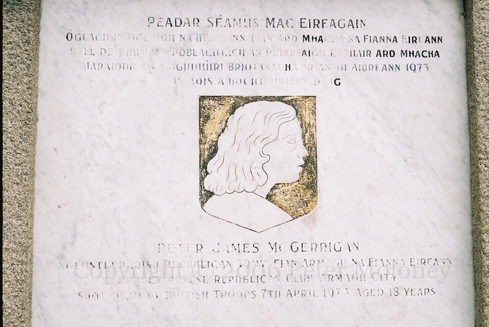 “Peadar Séamus Mac Eıreagaın, óglach in Óglaıgh Na hÉıreann, fıan Ard Mhacha Na Fıanna Éıreann, ball de Chumann Poblachtach An Phıarsaıgh cathaır Ard Mhacha. Maraíodh ag saıghdıúırí Brıotanacha ar an 7ú Aıbreann 1973 in aoıs a hocht mblıan deag.” “Peter James McGerrigan, volunteer Irish Republican Army, fian Armagh Na Fıanna Éıreann, member Pearse Republican Club Armagh City, shot dead by British troops 7th April 1973 aged 18 years.”