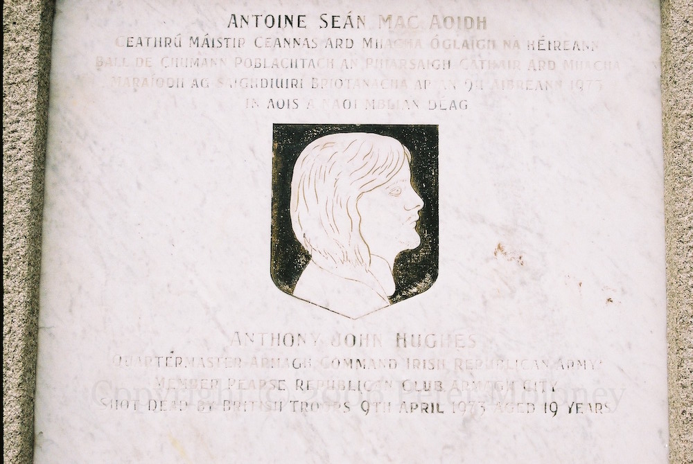 “Antoıne Seán Mac Aoıdh, ceathrú máıstır ceannas Ard Mhacha Óglaıgh Na hÉıreann, ball de Chumann Poblachtach An Phıarsaıgh cathaır Ard Mhacha. Maraíodh ag saıghdıúırí Brıotanacha ar an 9ú Aıbreann 1973 in aoıs a naoı mblıan déag.” “Anthony John Hughes, quartermaster Armagh command, Irish Republican Army, member Pearse Republican Club, Armagh city, shot dead by British troops 9th April 1973 aged 19 years.”
