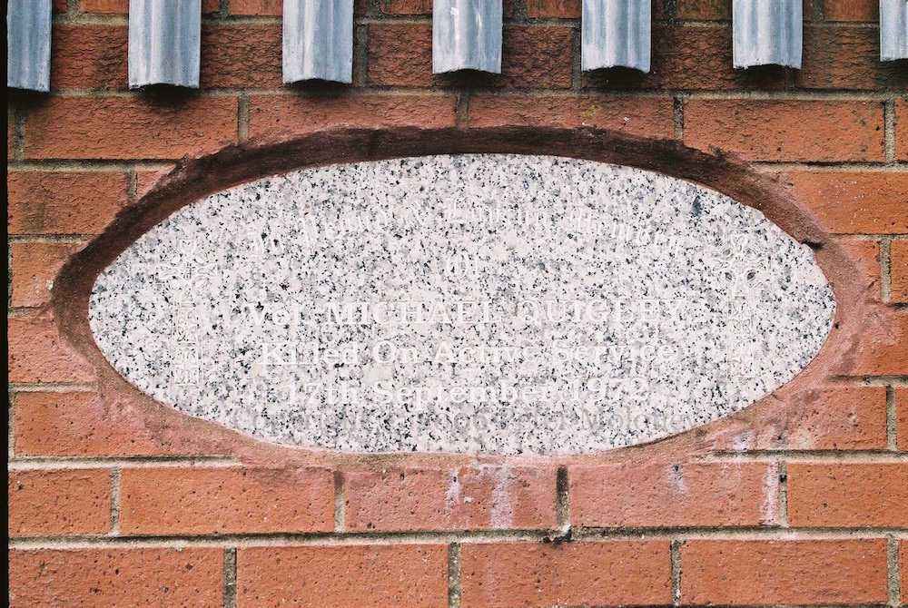 Memorial stone to IRA volunteer Michael Quigley, embedded in the wall at the top of Central Drive, Derry. For a clearer impression, see the image from 2003.
