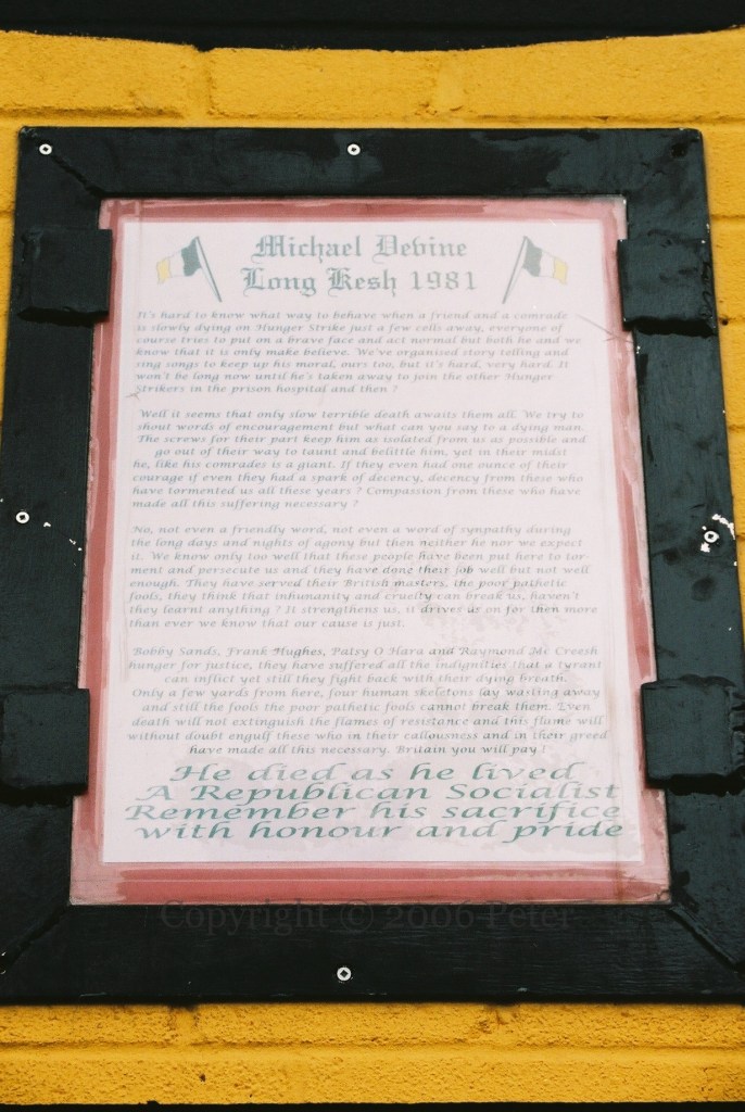 Bobby Sands, Frank Hughes, Patsy O’Hara and Raymond McCreesh hunger for justice, they have suffered all the indignities that a tyrant can inflict yet still they fight back with their dying breath. Only a few yards from here, four human skeletons lay wasting away and still the fools the poor pathetic fools cannot break them. Even death will not extinguish the flames of resistance and this flame will without doubt engulf these who in their callousness and in greed have made all this necessary. Britain you will pay!”