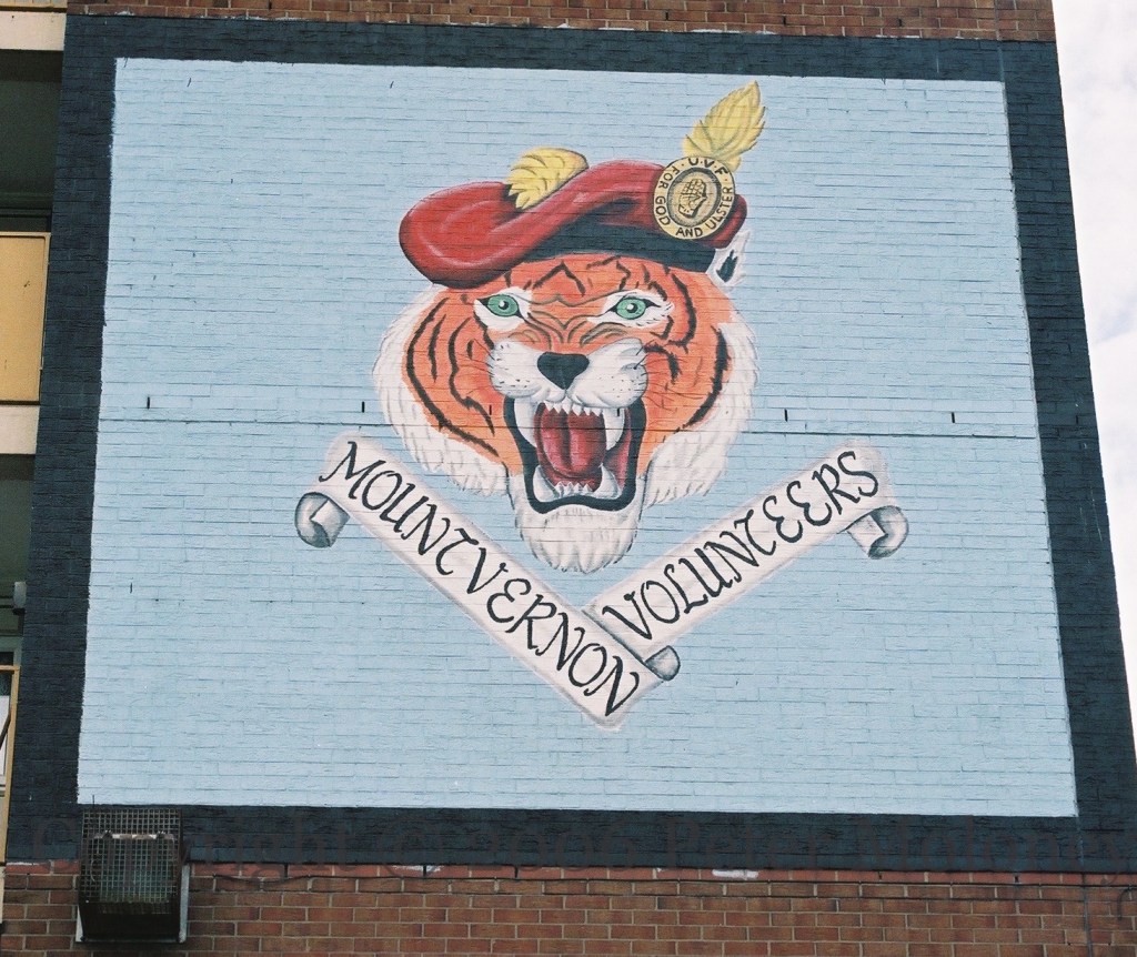 These four images are all from Ross House at the entrance to Mount Vernon. They show a UVF gunman (slipping behind a security camera), a tiger mascot, YCV and UVF emblems, and graffiti at the front of the building.