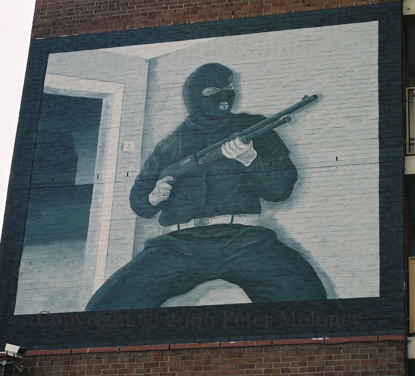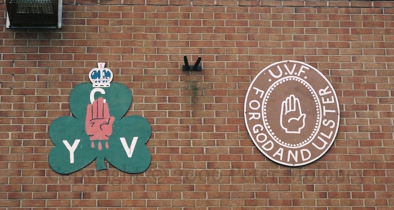 These four images are all from Ross House at the entrance to Mount Vernon. They show a UVF gunman (slipping behind a security camera), a tiger mascot, YCV and UVF emblems, and graffiti at the front of the building.