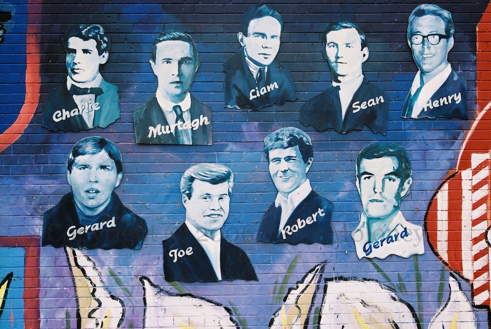 “Unbowed, unbroken.” This is a version of the earlier Éıre/Ireland mural (depicted as a female in the centre of the mural) seen in 2005. Portraits of 18 local republicans are included, beginning with Charlie Monahan and Murtagh McAstocker. This mural is similar to the earlier one on the shop gable (which had 16 portraits).