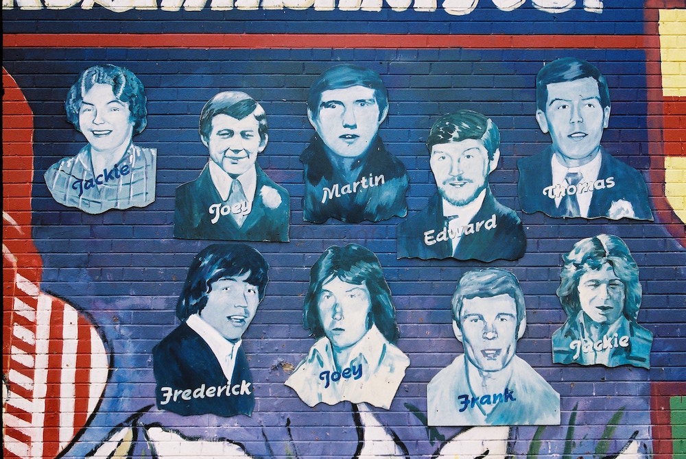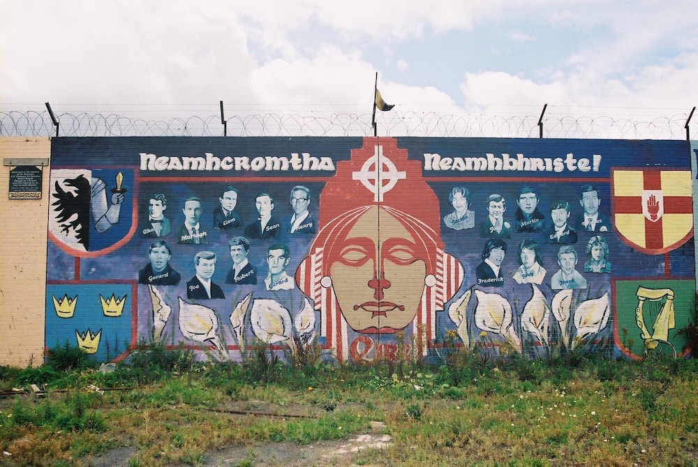 “Unbowed, unbroken.” This is a version of the earlier Éıre/Ireland mural (depicted as a female in the centre of the mural) seen in 2005. Portraits of 18 local republicans are included, beginning with Charlie Monahan and Murtagh McAstocker. This mural is similar to the earlier one on the shop gable (which had 16 portraits).