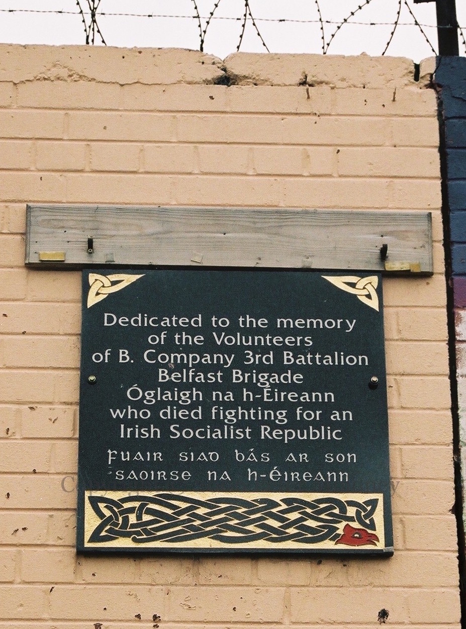 The plaque to the left reads “Dedicated to the memory of the volunteers of B company 3rd battalion Belfast brigade Óglaıgh na hÉıreann who died fighting for an Irish socialist republic. Fuaır sıad bás ar son saoırse na hÉıreann.”