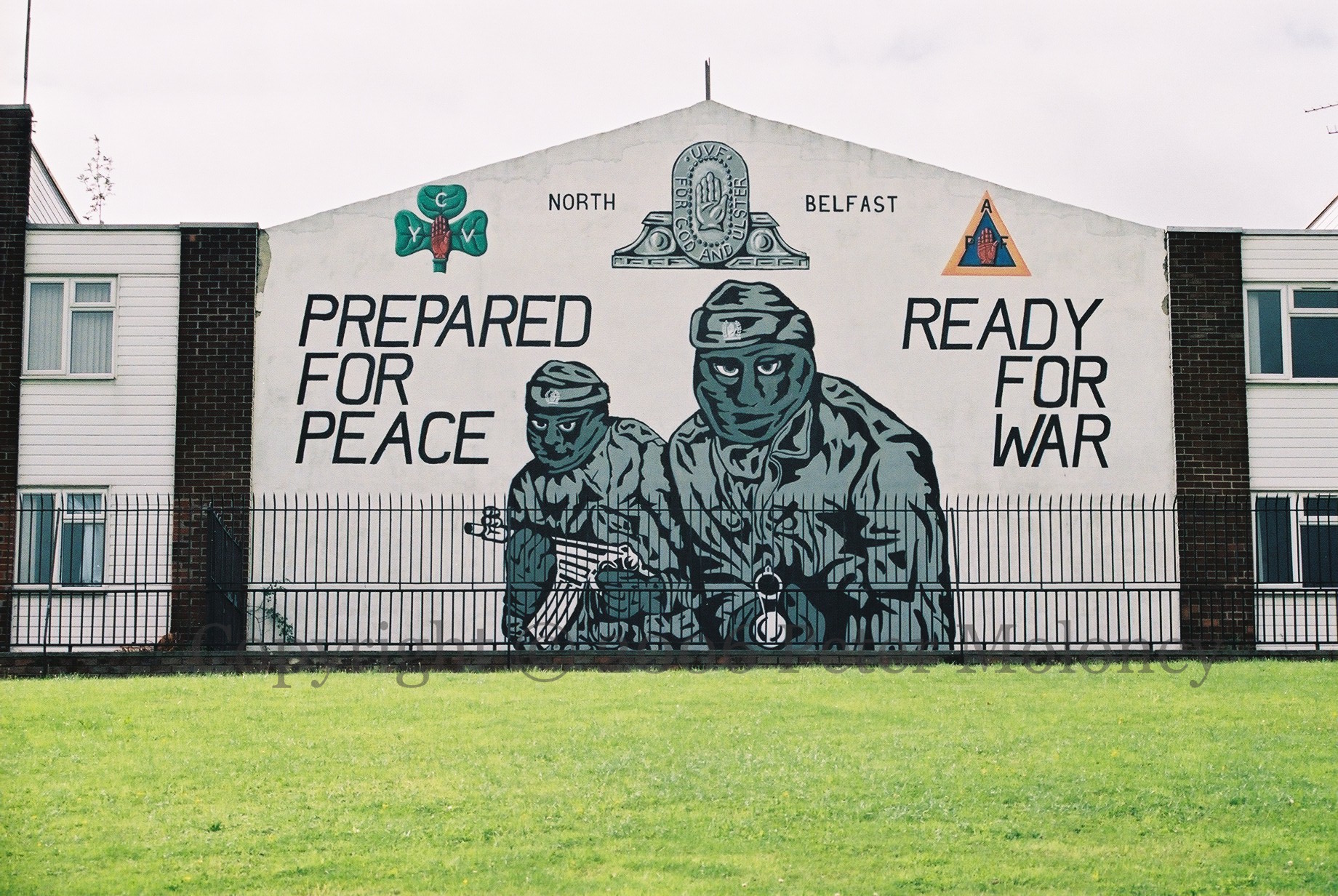 After the row of houses on which it originally appeared was knocked down, the mural to the North Belfast UVF/YCV/PAF [Protestant Action Force] “Prepared for peace, ready for war”, with its two hooded gunmen, was moved up on the hill, at eye-level with the motorway roundabout c. 2001.