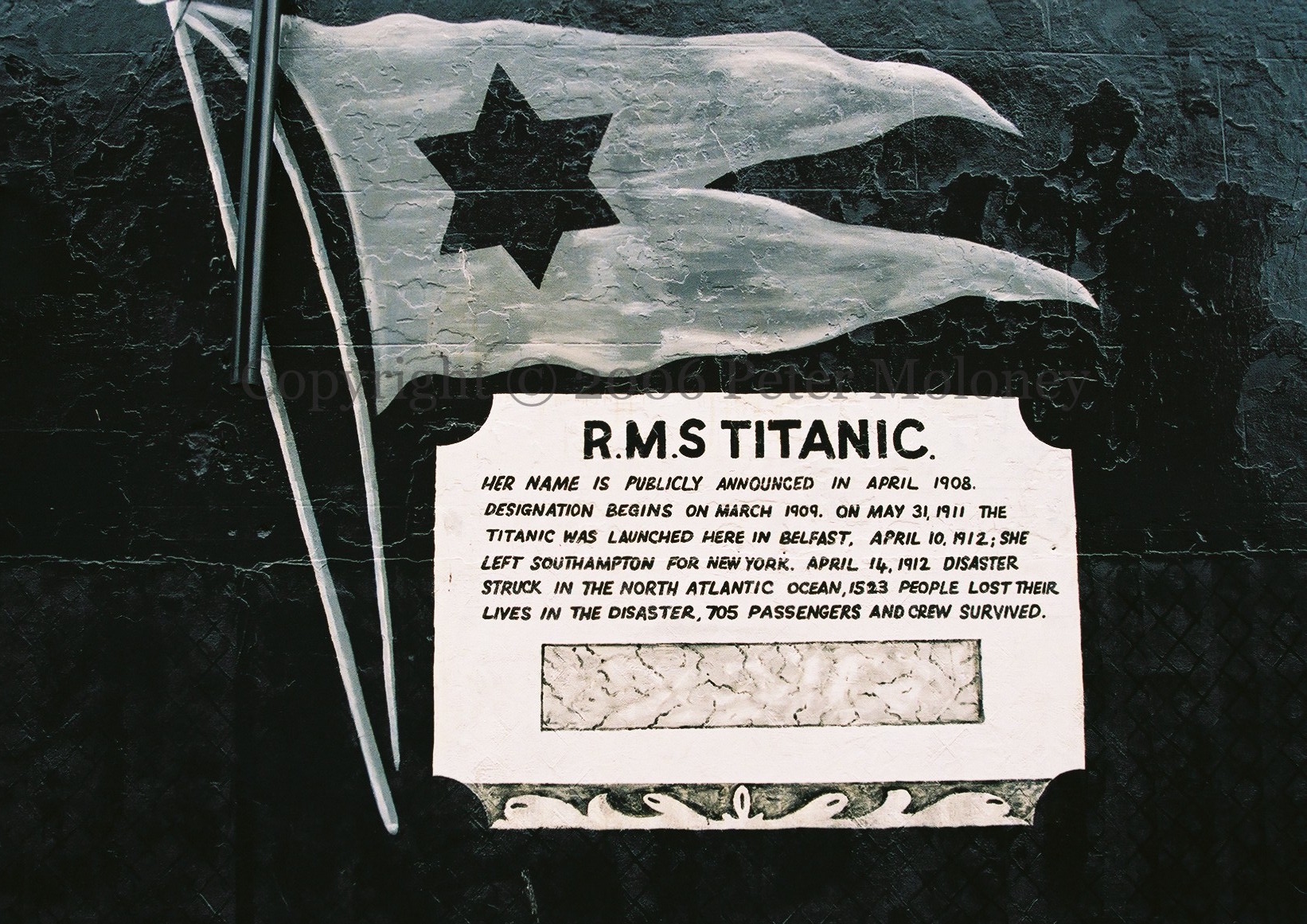 “Her name is publicly announced in April 1908. Designation begins in March 1909. On May 31. 1911, the Titanic was launched here in Belfast, April 10, 1912. She left Southampton for New York. April 14, 1912 disaster struck in the North Atlantic ocean, 1523 people lost their lives in the disaster, 705 passengers and crew survived.” “This mural is respectfully dedicated to the men, women and children who lost their lives in the waters of the North Atlantic on the night of April 14, 1912: to those who survived – whose lives from that night on were forever altered; and to those who built the Titanic [at Harland and Wolff]. We forget them not.”