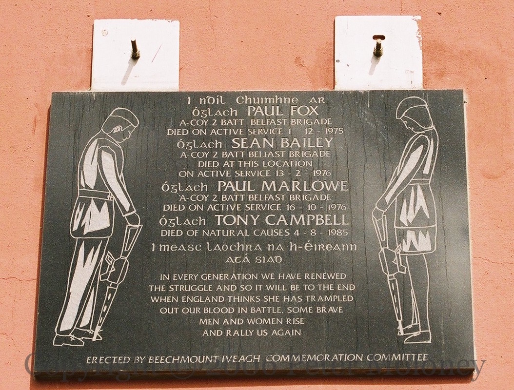 “I ndíl [ndıl] chuımhne ar Óglach Paul Fox A-Coy 2 Batt Belfast Brigade, died on active service 1-12-1975, Óglach Sean Bailey A-Coy 2 Batt Belfast Brigade, died at this location on active service 13-2-1976, Óglach Paul Marlowe A-Coy 2 Batt Belfast Brigade, died on active service 16-10-1976, Óglach Tony Campbell died of natural causes 4-8-1985. I measc laochra na hÉıreann atá sıad. In every generation we have renewed the struggle and so it will be to the end. When England thinks she has trampled out our blood in battle, some brave men and women rise and rally us again.”