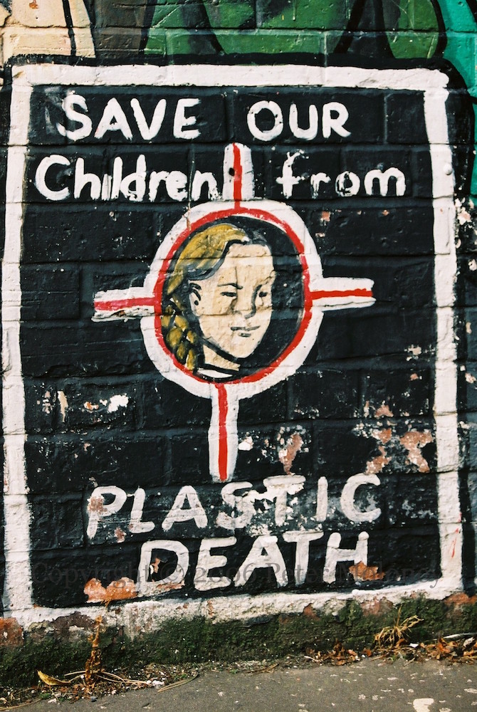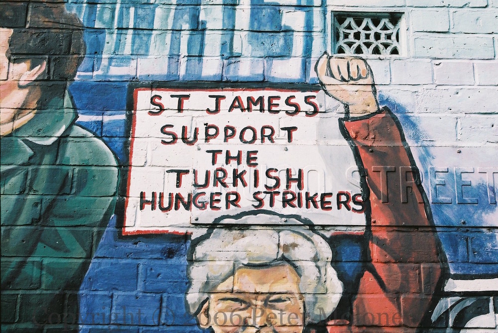 Here is a wide shot and some details of the two-part mural in Hugo Street, seen in progress in 2001 and completed in 2002. On the left is a depiction of the funeral of Joe McDonnell; on the right, posters and protesters from the time of the hunger strikes.