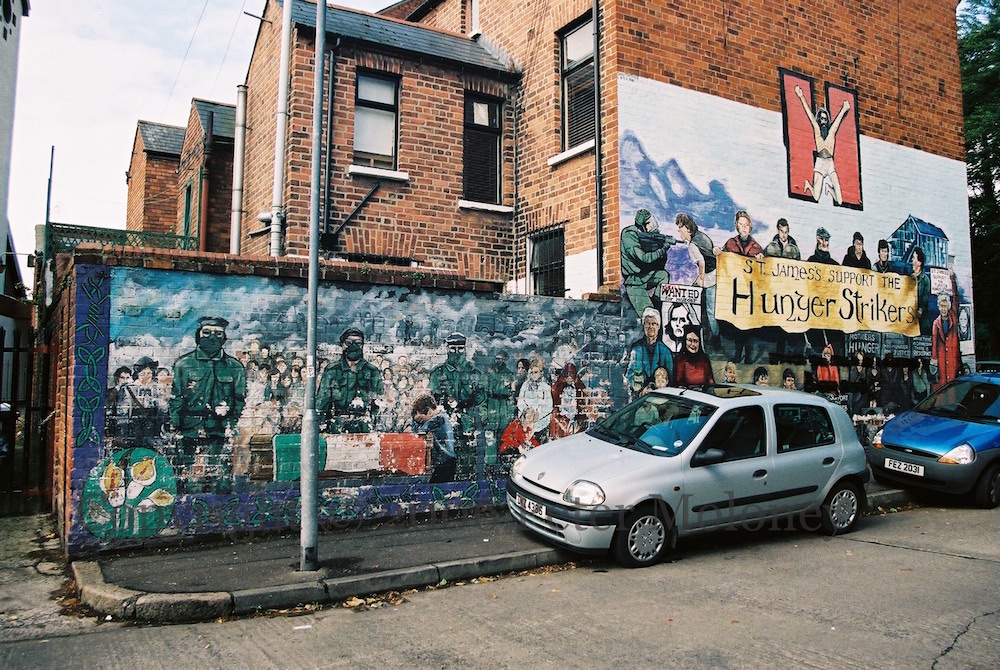 Here is a wide shot and some details of the two-part mural in Hugo Street, seen in progress in 2001 and completed in 2002. On the left is a depiction of the funeral of Joe McDonnell; on the right, posters and protesters from the time of the hunger strikes.