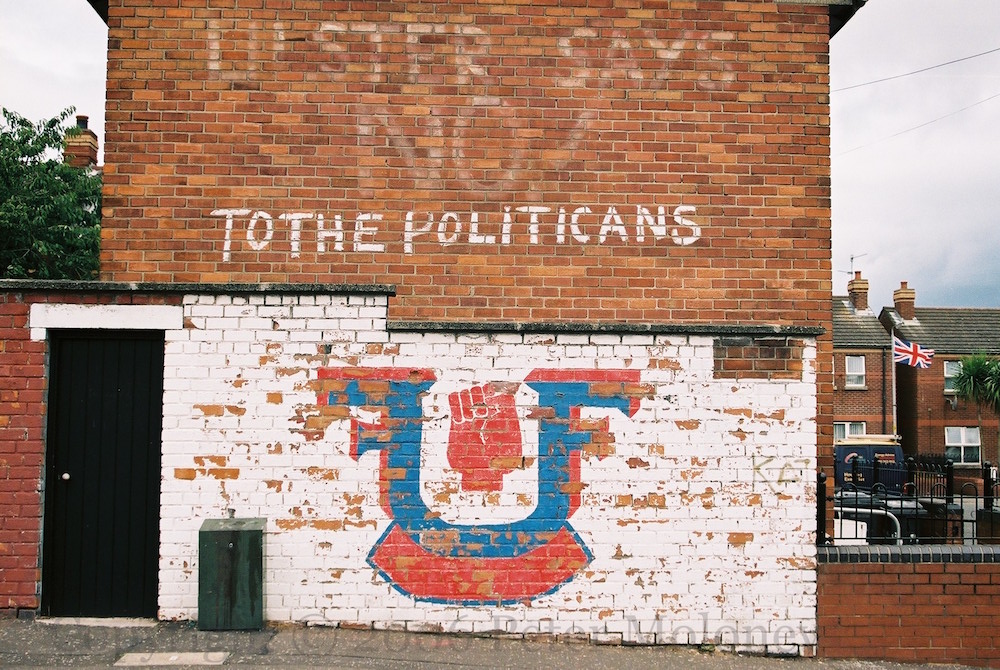 “Ulster says no – to the politic[i]ans”. The top part goes back to at least 1993; the UFF emblem – in vintage style – is more recent (J0277 is from 1999).