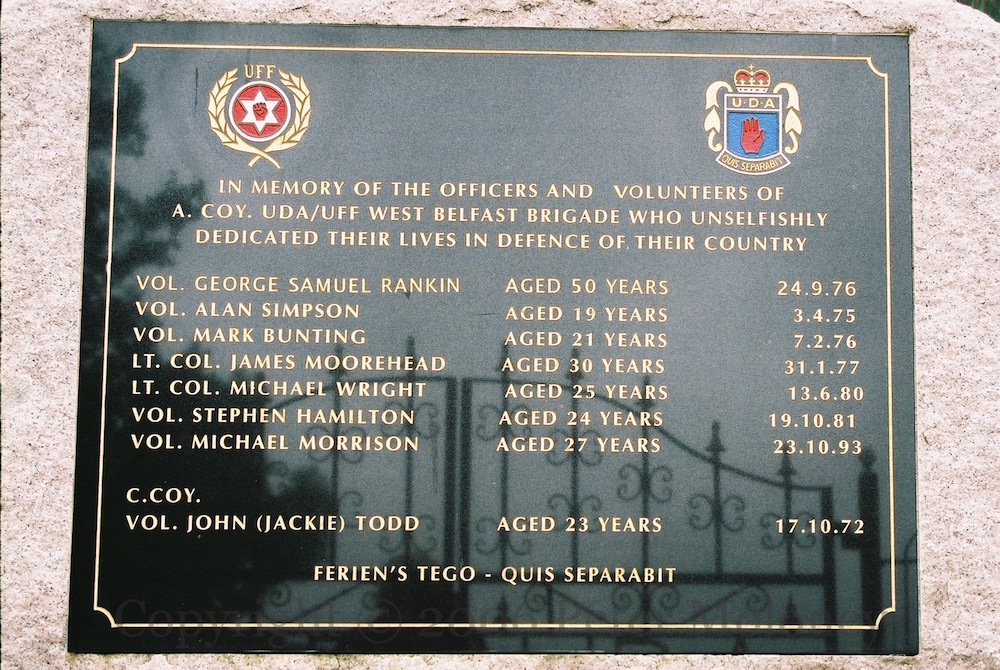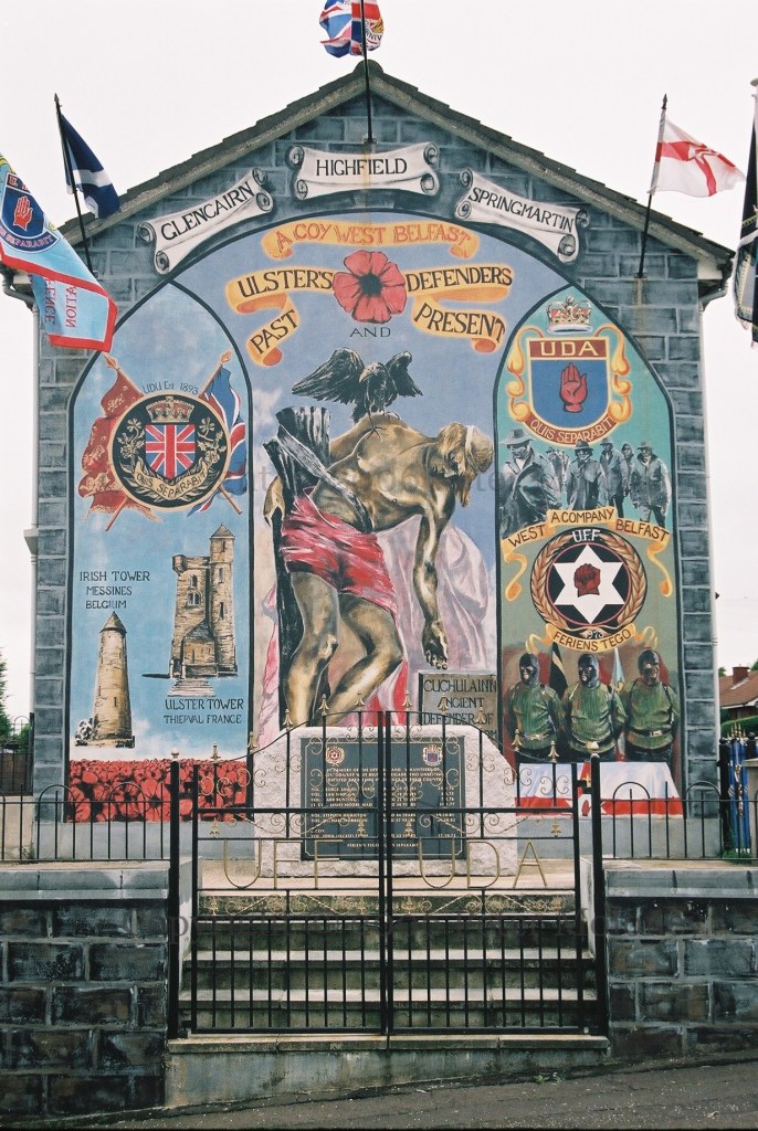 Ulster’s defenders, past and present, from Cuchulainn “Ancient defender of Ulster from Gael attacks”, via the 1893 UDU and WWI soldiers memorialised in the towers at Messines and Thiepval, to the modern UDA/UFF: “In memory of the officers and volunteers of A. Coy. UDA/UFF West Belfast Brigade who unselfishly dedicated their lives in defence of their country.”
