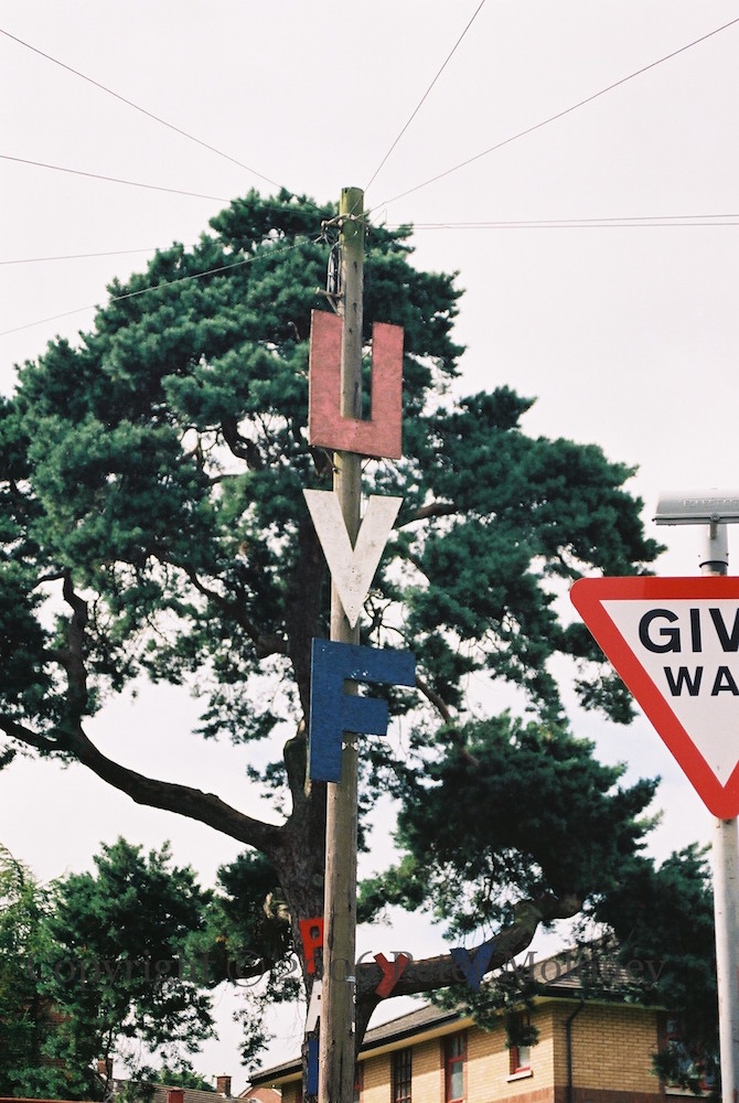 UVF 2006-08-192025-03-04Extramural Activity “UVF” letter-boards on the electricity pole and “PAF” and “Y[C]V” on the tree behind in Mount Vernon Road and Park, Belfast. Click image to enlargeCopyright © 2006 Peter MoloneyM03029 Share this: Share on X (Opens in new window) X Share on Facebook (Opens in new window) Facebook Like Loading... Related