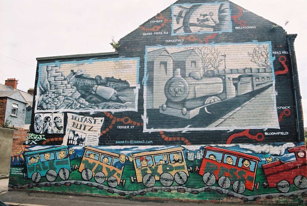 This mural by Blaze FX is opposite Walkway Community Centre (web) in Finvoy Street, Belfast. The railway between Belfast and Comber no longer exists; it is now a 7 mile cycle path. The place-names on the mural are stops on the old ‘Belfast & County Down’ system. Also depicted is the Belfast Blitz, which was in 1941, with targets including the Connswater fuel station (BBC).