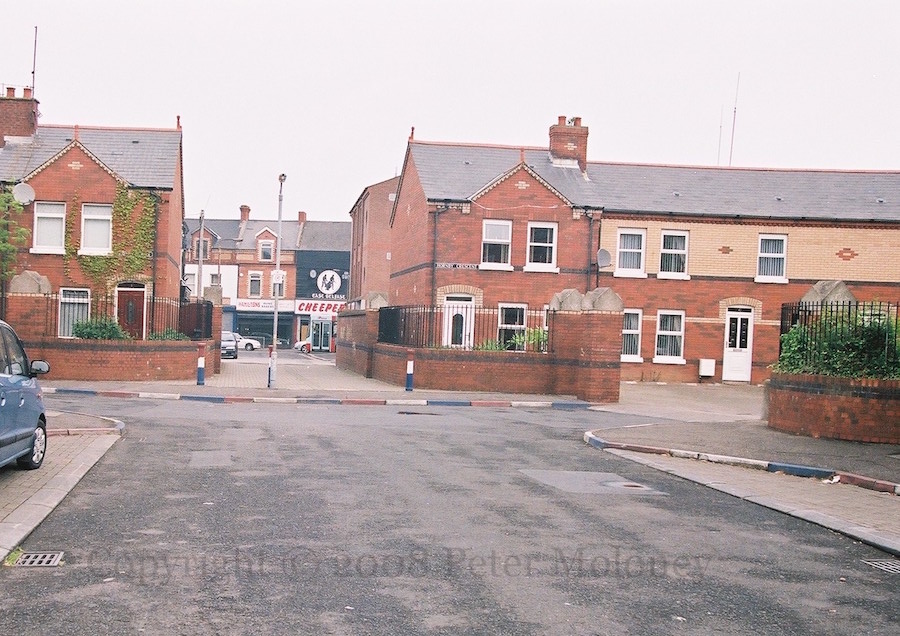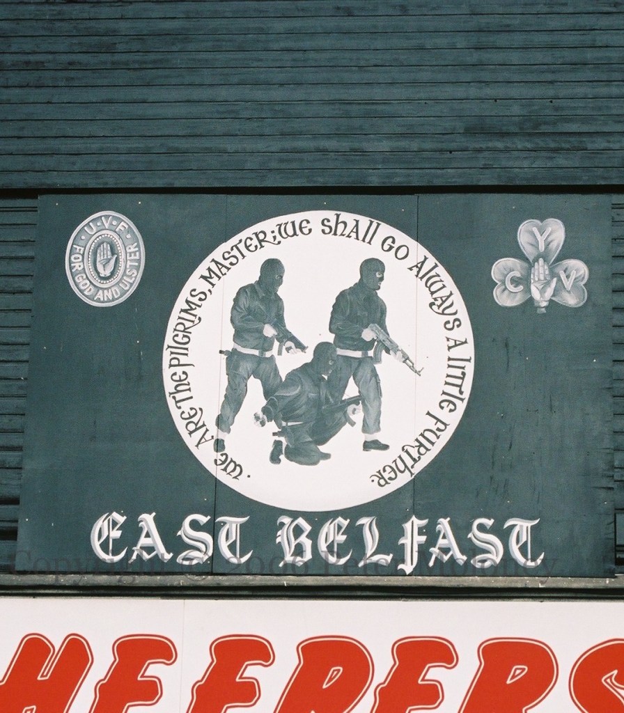 “We are the pilgrims, master; we shall always go a little further.” Copy of a UVF Tamar Street mural (perhaps after that area was redeveloped) above Cheepers on the Newtownards Road, Belfast. Below that is the view from Chamberlain Street in 2008, looking out over the red-white-and-blue kerbstones.