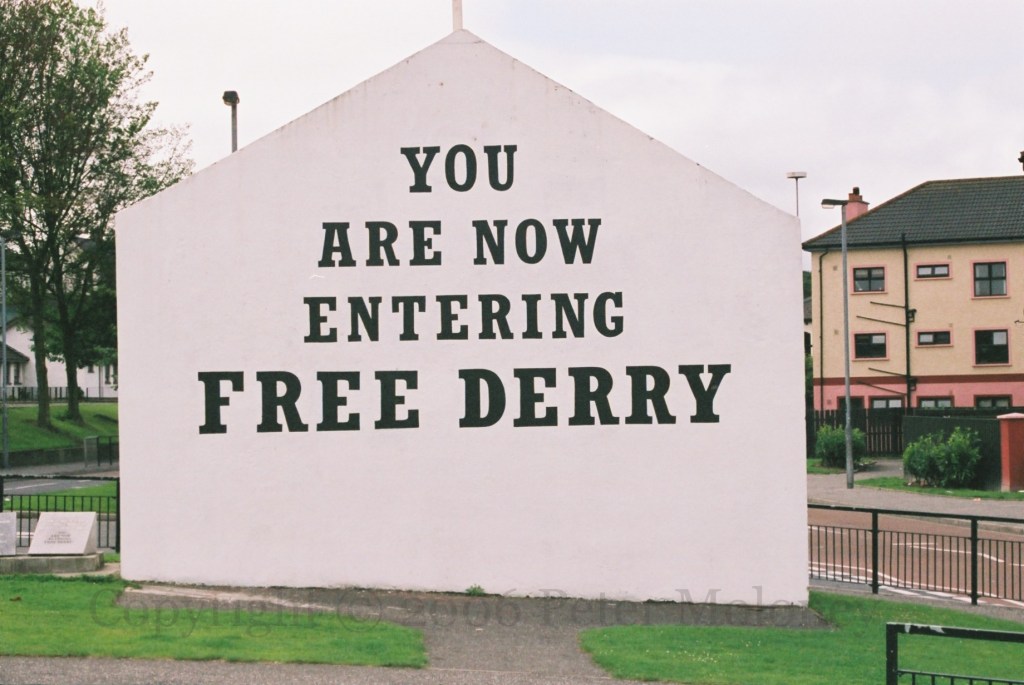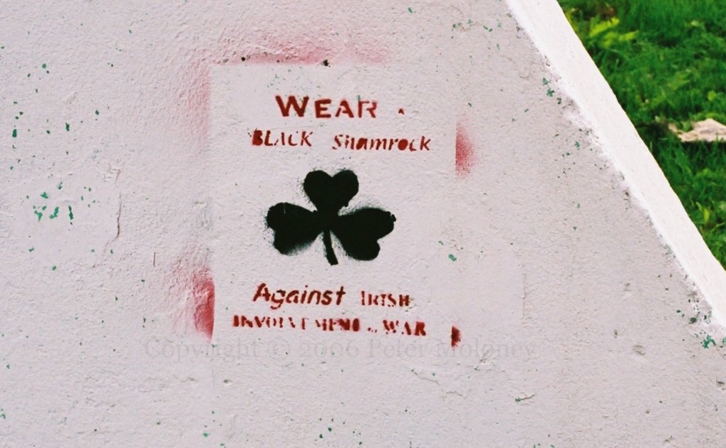 “Wear a black shamrock against Irish involvement in war” – possibly a reference to Raytheon. The stencil is on an otherwise pristine Free Derry Corner.
