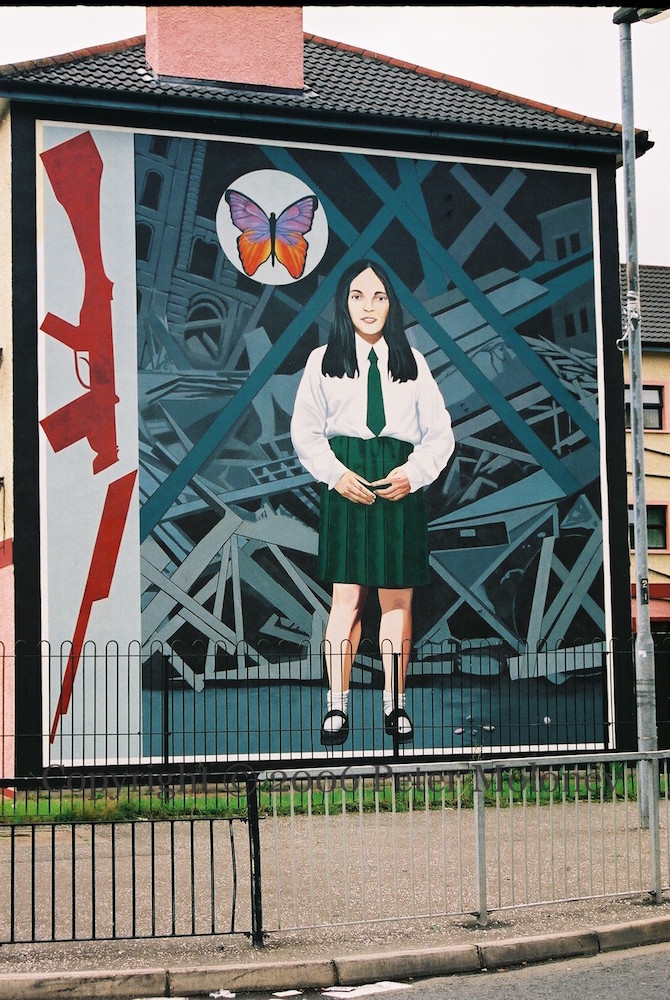 The mural to the first child killed in the Troubles, Annette McGavigan, entitled The Death Of Innocence, was repainted by the Bogside Artists in 2006. On account of the success of the peace process and IRA decommissioning of weapons, the rifle on the left is broken. The info board is from 2007.