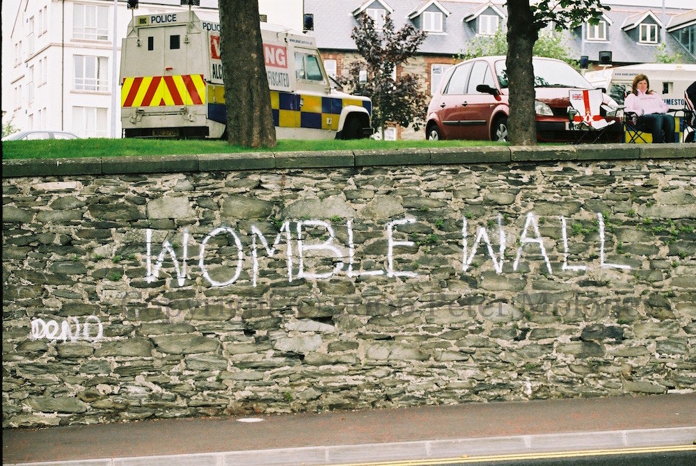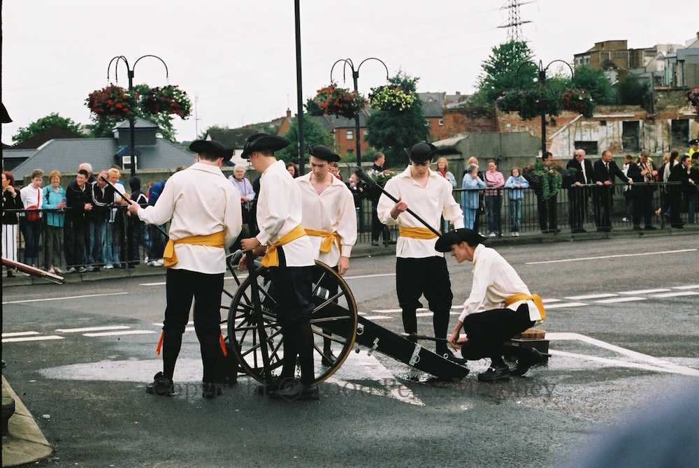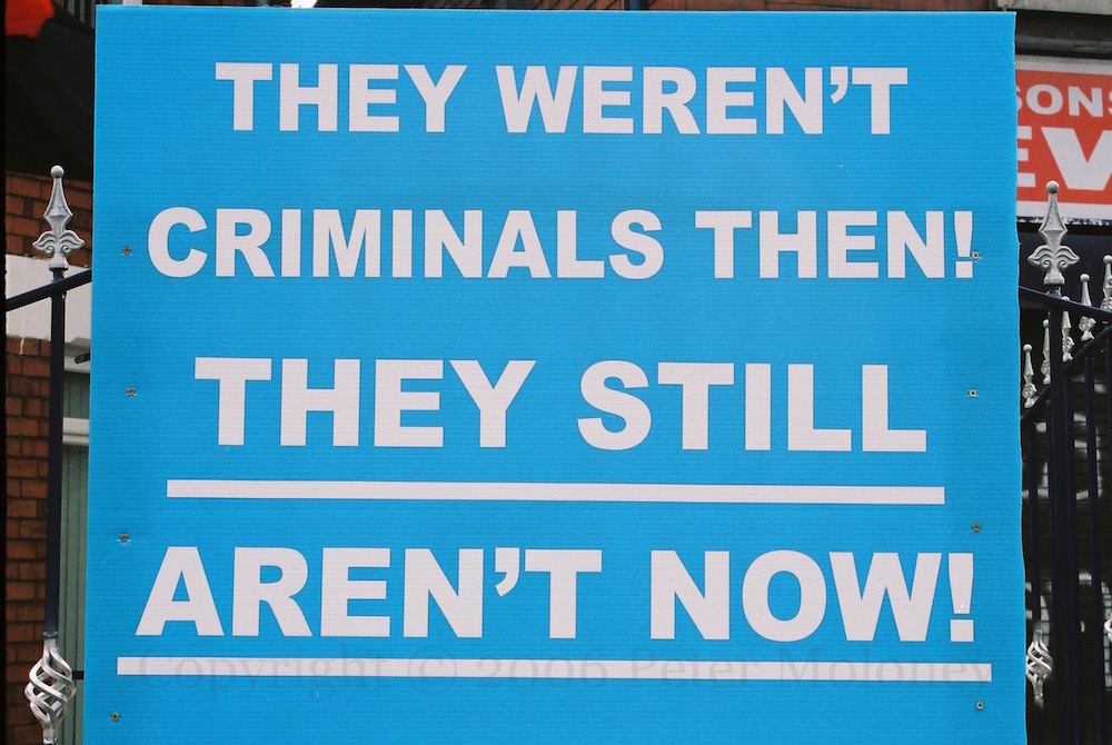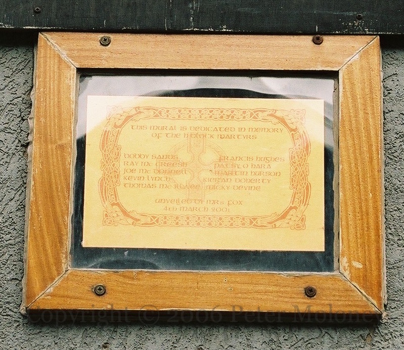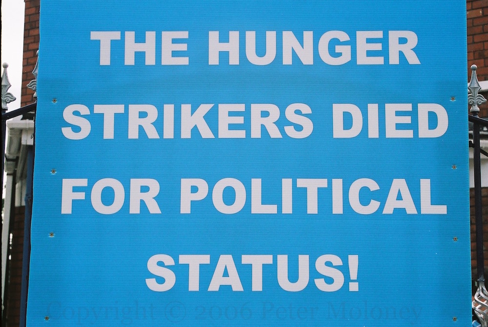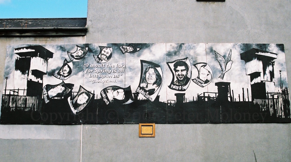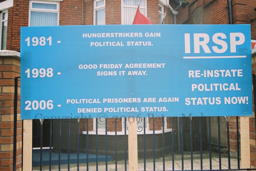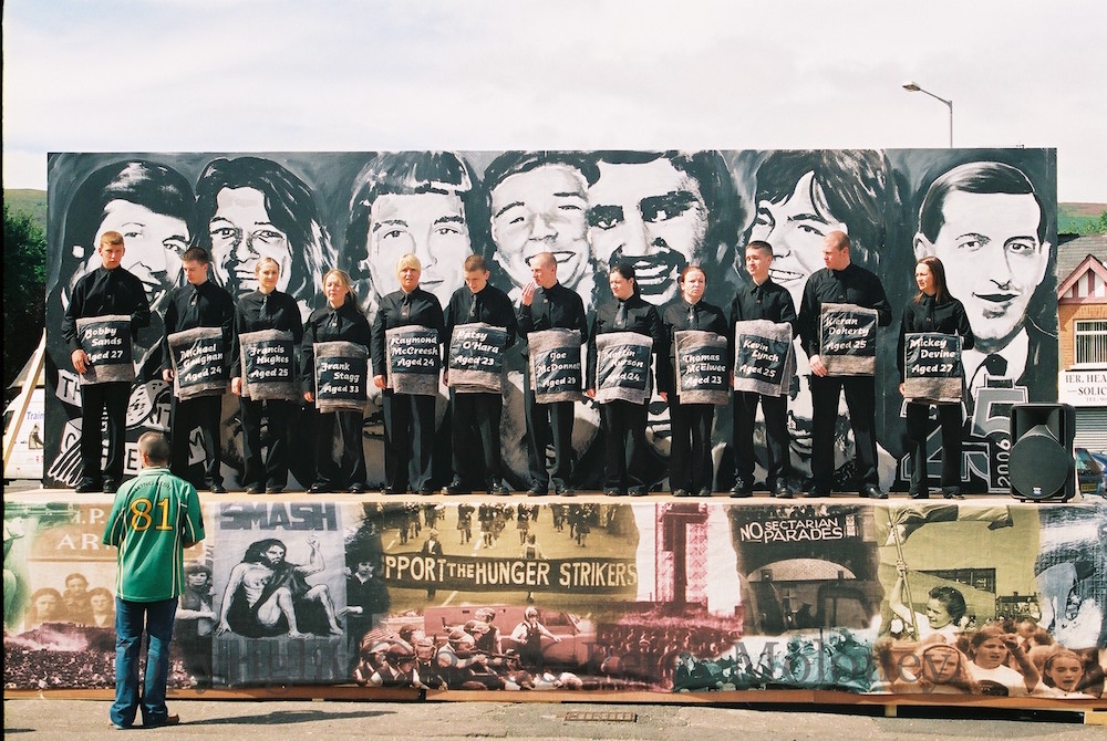 Stages of the “conveyor belt” – arrest by the Army, trial before a Diplock court, strip searches in Long Kesh and Armagh, the dirty protest, supported by an RAC [Relatives Action Committee], and finally, hunger strikes – are recreated in murals and reenactments on flat-bed lorries along the Falls Road for the 25th anniversary of the 1981 hunger strike.