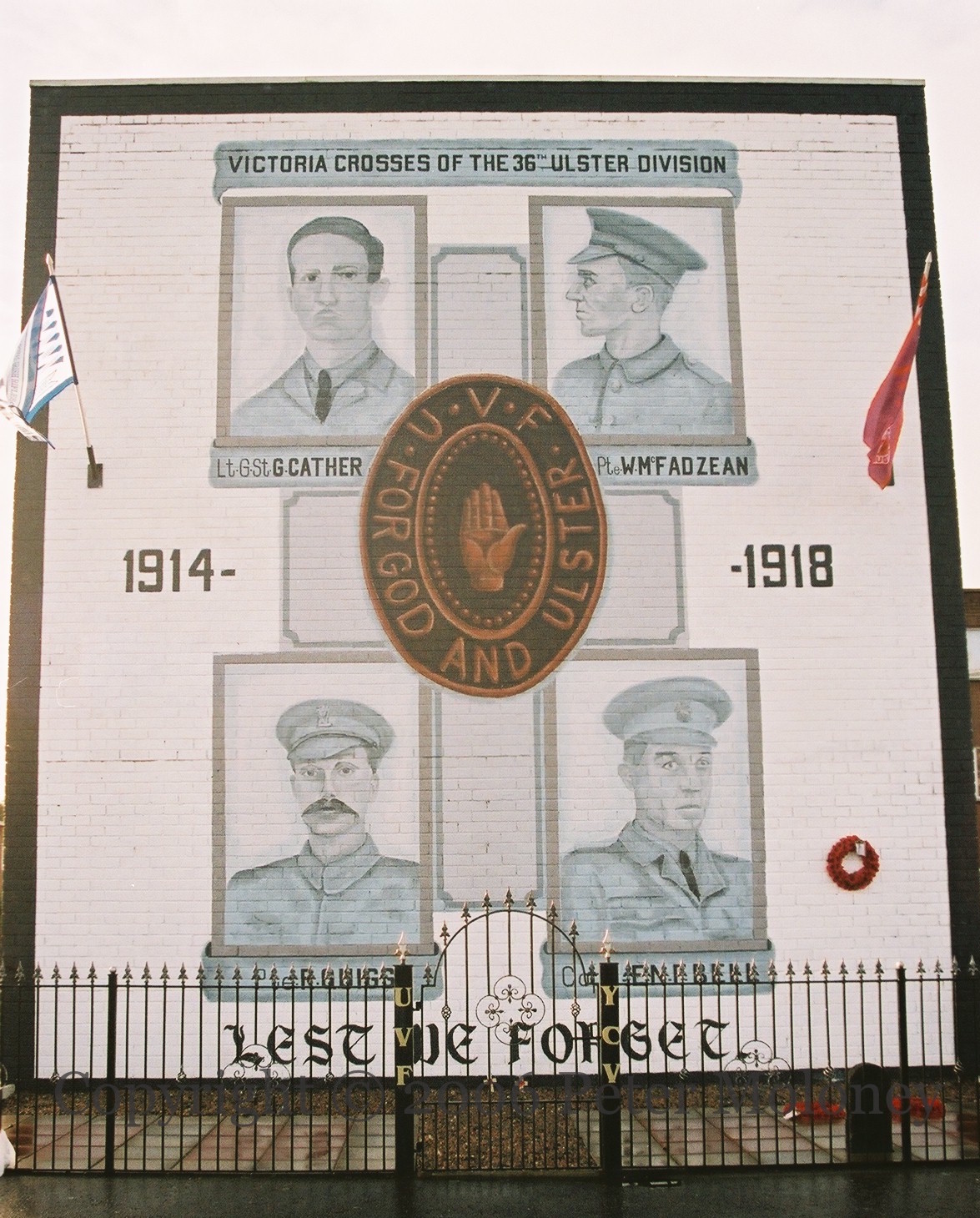 Four VC recipients from the 36th (Ulster) Division in WWI are honoured in a mural in Cappagh Gardens: G[eoffrey] St. G[eorge] S[hillington] Cather, W[illiam] F[rederick] MacFadzean, R[obert] Quigg, and E[ric] N[orman] F[rankland] Bell.