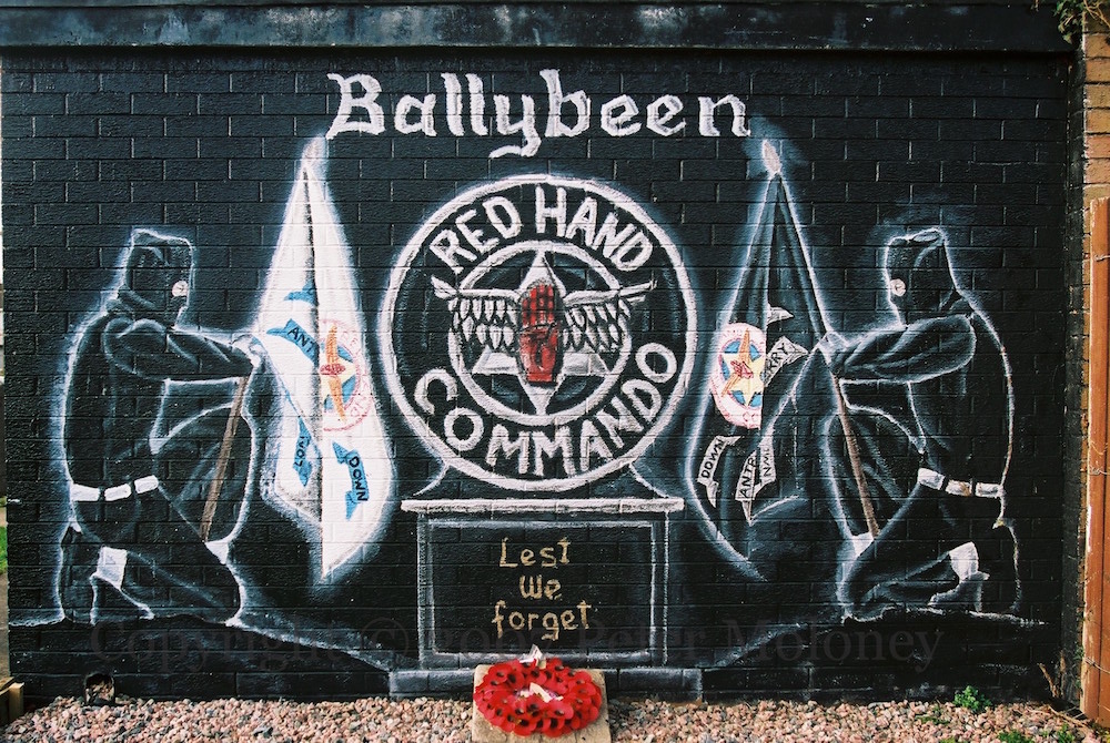 The “UVF” on the storage units would be painted over, leaving only the memorial to the 36th (Ulster) Division. The Ballybeen RHC memorial mural on the side would remain until the building was redeveloped and both murals were replaced by a memorial garden.