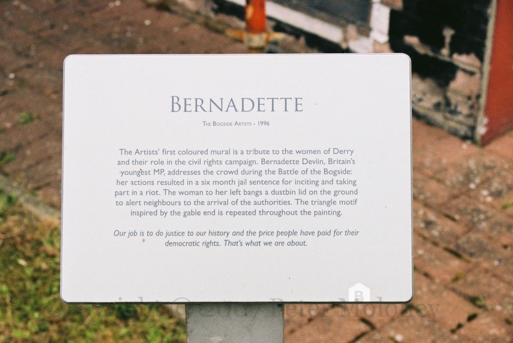 “The Artists’ first coloured mural is a tribute to the women of Derry and their role in the civil rights campaign. Bernadette Devlin, Britain’s youngest MP, addresses the crowd during the Battle of the Bogside: her actions resulted in a six month jail sentence for inciting and taking part in a riot. The woman to her left bangs a dustbin lid on the ground to alert neighbours to the arrival of the authorities. The triable motif inspired by the gable end is repeated throughout the painting. Our job is to do justice to our history and the price people have paid for their democratic rights. That’s what we are about.“