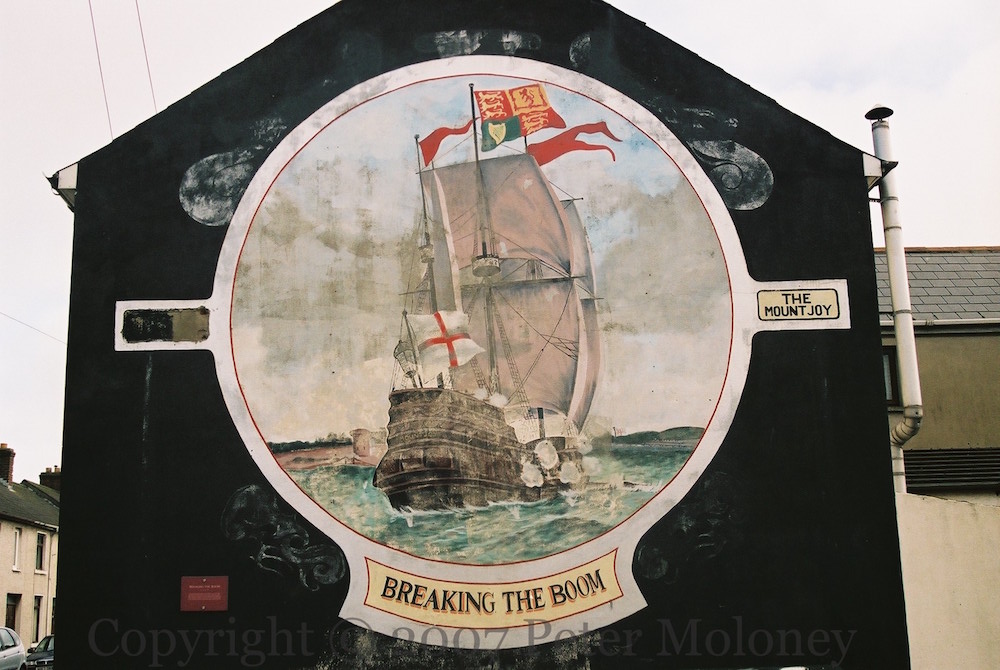 An information plaque is added to the “Breaking the boom” mural by Attitude Artwork in Roulston Avenue, Londonderry. This mural shows the Mountjoy in full sail. She was one of the ships which broke the timber boom across the Foyle to relieve the siege in 1689. This is one of a number of murals commemorating the 1689 siege in the Waterside and Fountain areas of the city. The mural was painted by local community artists Dee Logan, Mark Logan and Marty Edwards.” Seen previously in 2003.
