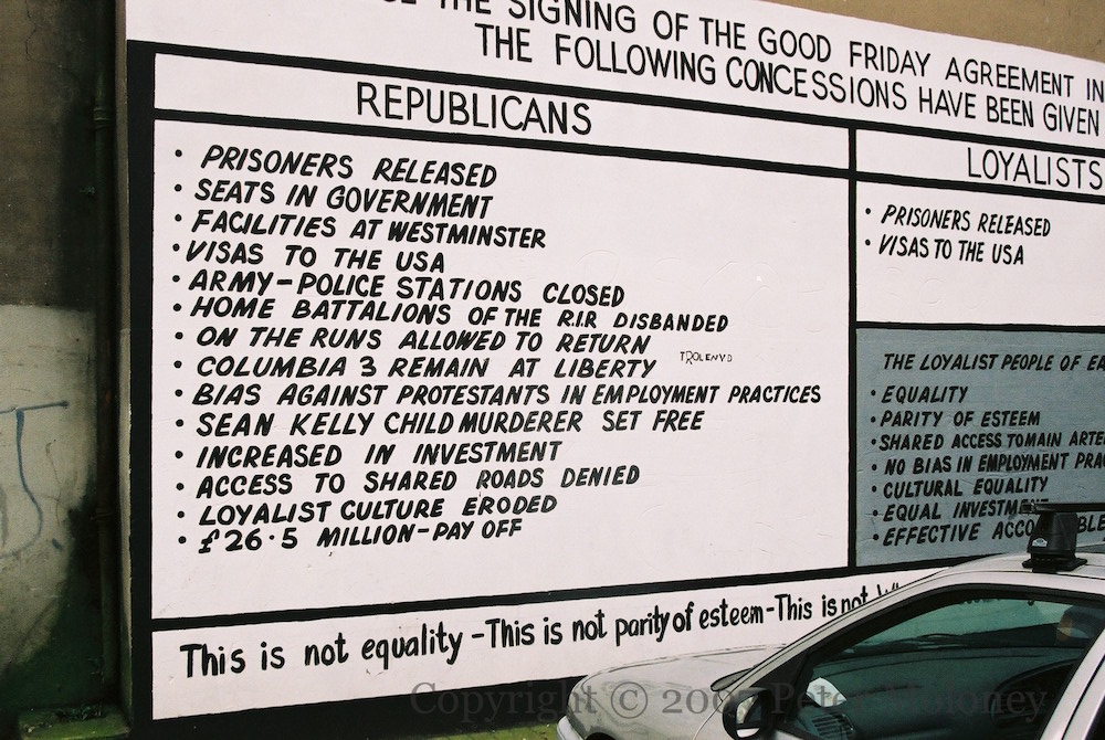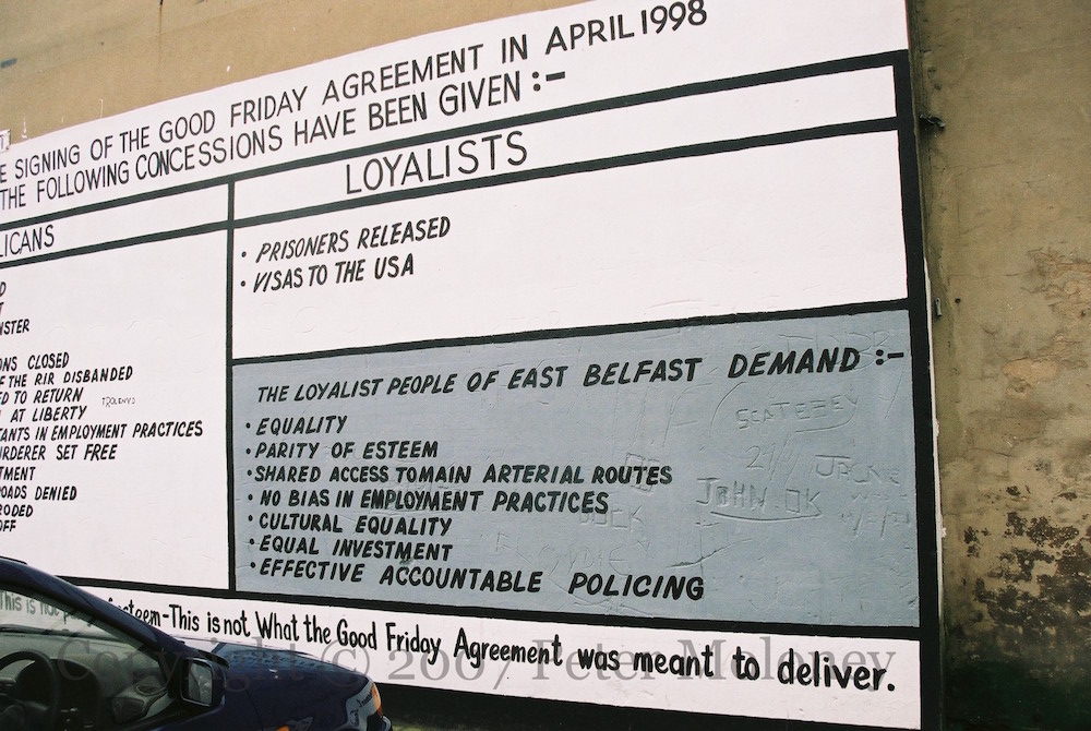 “Since the signing of the Good Friday Agreement in April 1998 the following concessions have been given :- Republicans: Prisoners released, facilities at Westminster, visas to the USA, army-police stations closed, home battalions of the RIR disbanded, on the runs allowed to return, Columbia 3 remain at liberty, bias against Protestants in employment practices, Sean Kelly child murdered set free, increased [sic] in investment, access to shared roads denied, loyalist culture eroded, £26.5 million pay off. The loyalist people of east Belfast demand:- equality, parity of esteem, shared access to main arterial routes, no bias in employment practices, cultural equality, equal investment, effective accountable policing. This is not equality, this is not parity of esteem, this is not what the Good Friday Agreement was meant to deliver.” Or, in short “Them’uns get everything and we get na’hin.”
