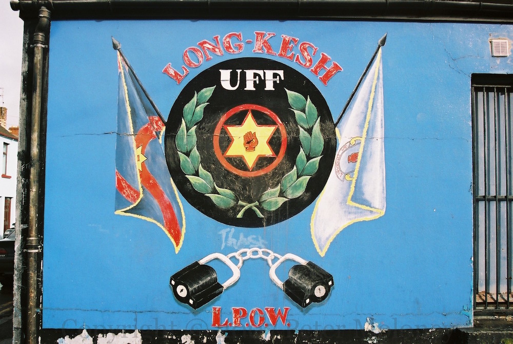2007 version of the UFF LPOW [Loyalist prisoners of war] mural in Ebrington Terrace, Waterside, Londonderry, seen previously in 1997 and 2005. The Ulster [Northern Ireland] nationalist flag is on the left.
