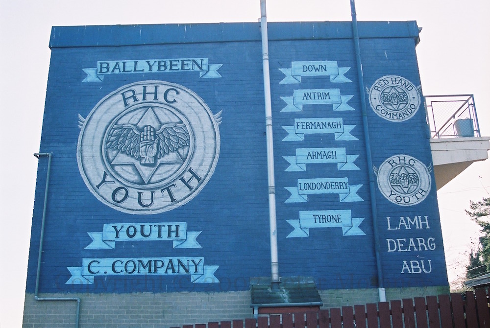 “Ballybeen Youth C. Company” Red Hand Commando, with the names of the six counties and the slogan “Lamh Dearg Abu” (a corruption of “Lámh Dhearg Abú”, “red hand to victory”). Next to another mural mentioning RHC Youth in Morven Park.