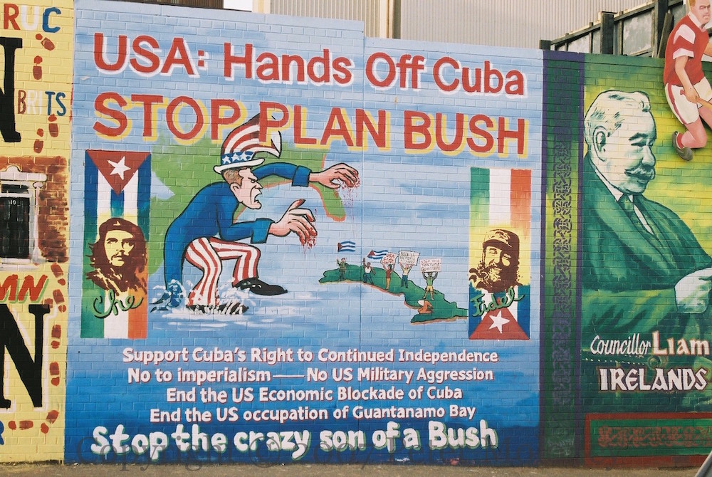 “USA: Hands off Cuba. Stop plan Bush. Support Cuba’s right to continued independence. No to imperialism, No US military aggression. End the US economic blockade of Cuba. End the US occupation of Guantanamo Bay. Stop the crazy son of a Bush.”