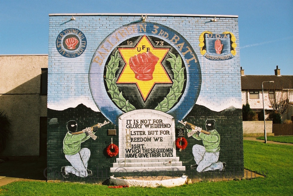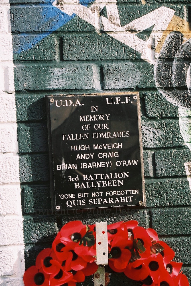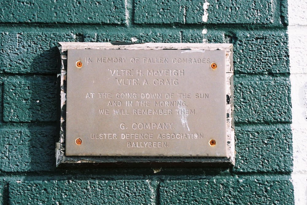 “It is not for glory we defend Ulster but for Freedom we Fight, which these good men have give their lives.” The men in question are “Vltr”s Hugh McVeigh, Andy Craig, and Brian (Barney) O’Raw from the UFF’s East Belfast brigade 3rd (Ballybeen) battalion (McVeigh and Craig are described as being from G company in the plaque on the right).