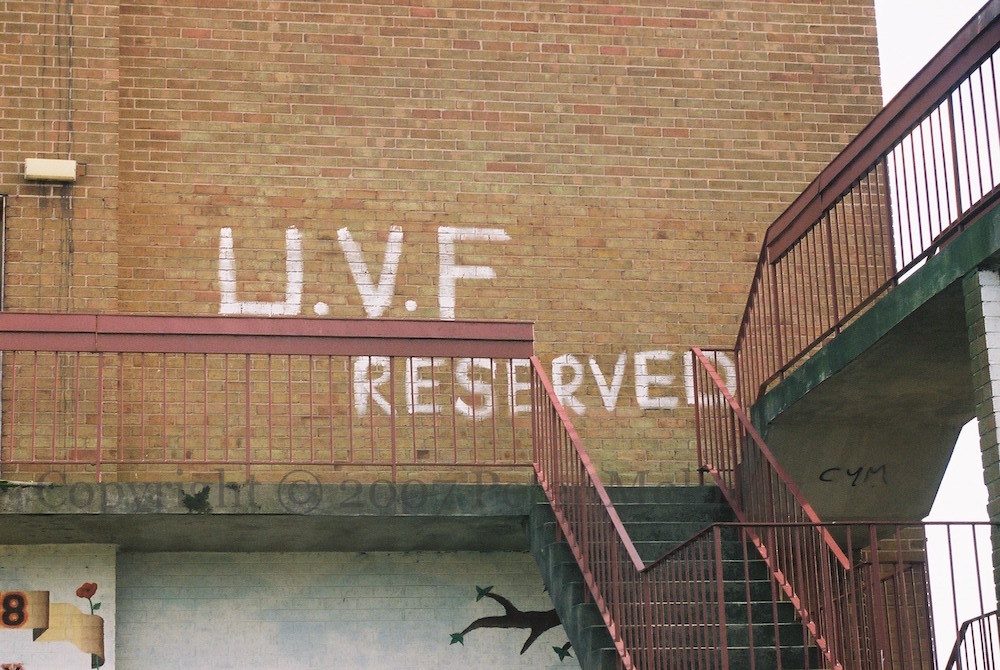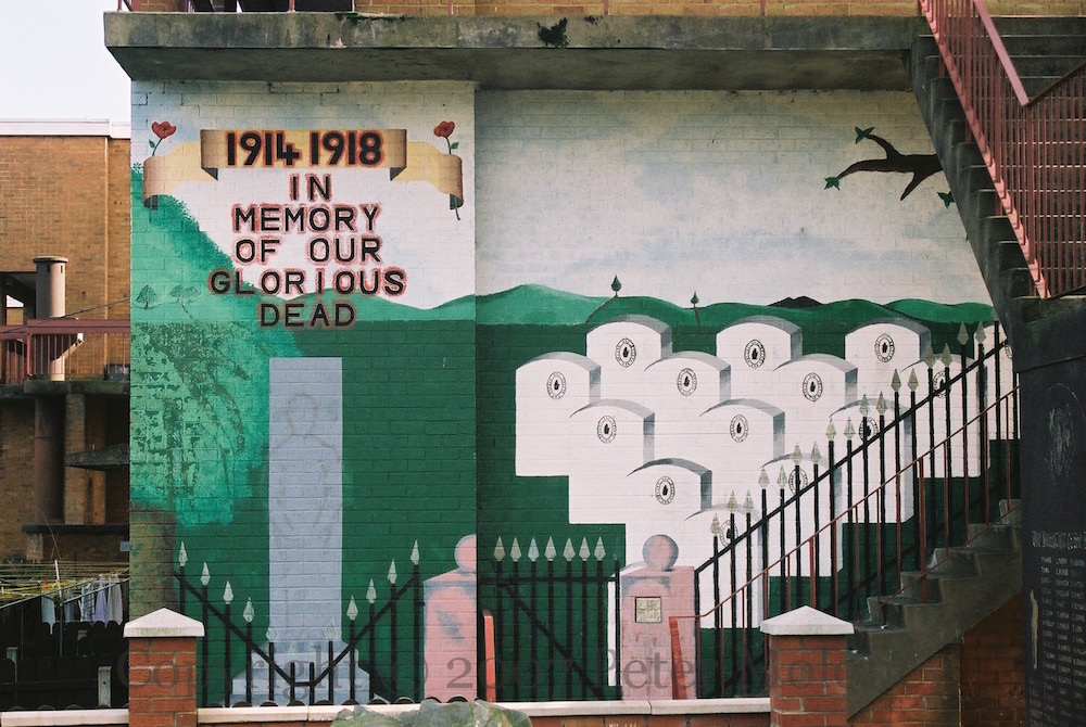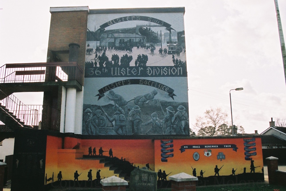 The upper image in the main mural is of workers leaving Harland & Wolff shipyard in 1911. In the lower image, they are shot in the trenches and suffer a gas attack in WWI.