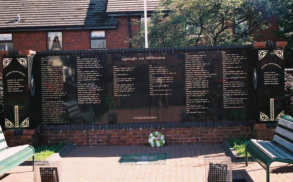 IRA volunteers from the New Lodge are “fondly remembered” in the (second) memorial garden, at the end of Donore Court. The portraits are to the left and the right of the lists of names.