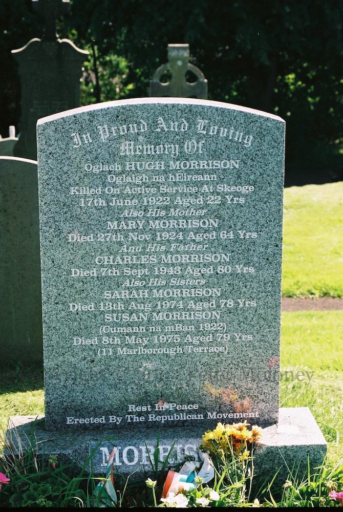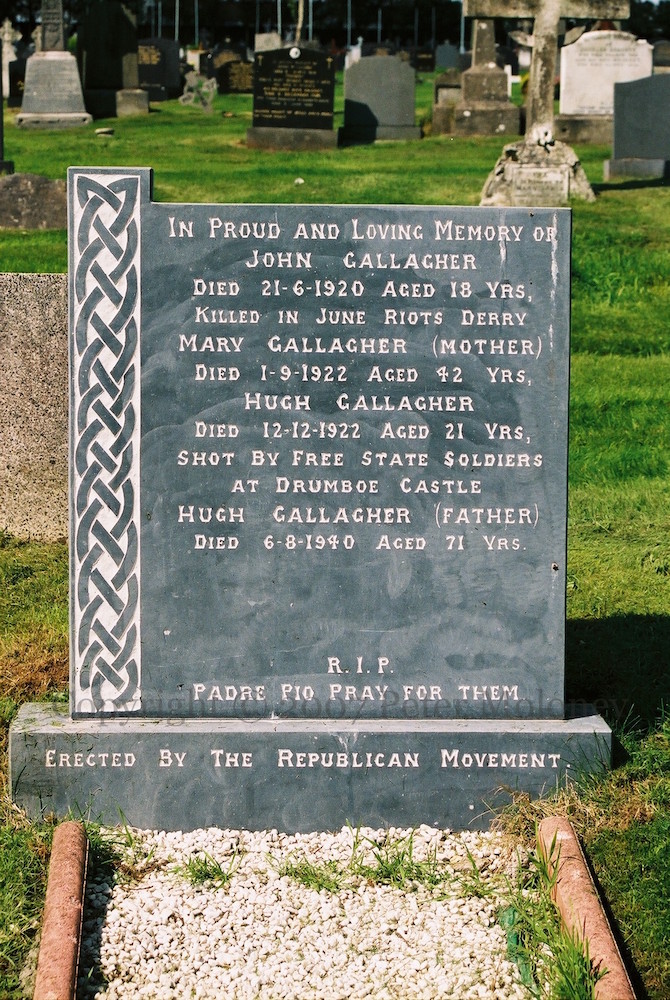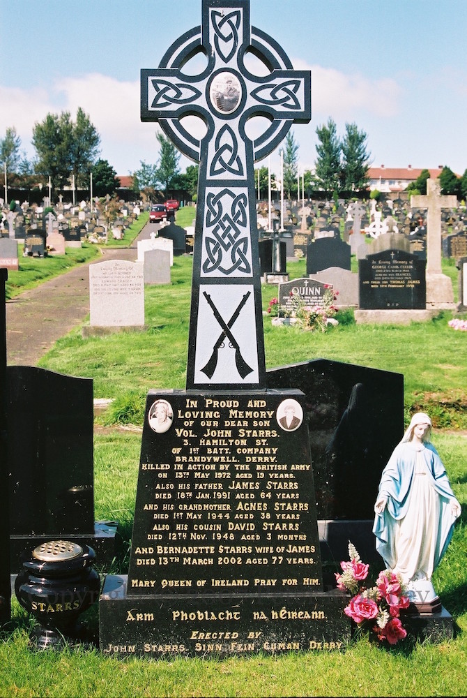 These three IRA gravestones are in Derry City Cemetery. The first is to Hugh and Susan Morrison, IRA and Cumann na mBan members in 1922 (findagrave/Derry Journal). Hugh died from a premature bomb explosion during a gun-battle at Skeog/Skeoge (p. 41 of 1916 Derry Rising Revisited). Brothers John and Hugh Gallagher – John was “killed in June [1920] Derry riots” while Hugh was “shot by Free State soldiers at Drumboe Castle [holding centre]” in 1922. Finally, John Starrs, killed in a gun battle with the British Army in William Street, in 1972.