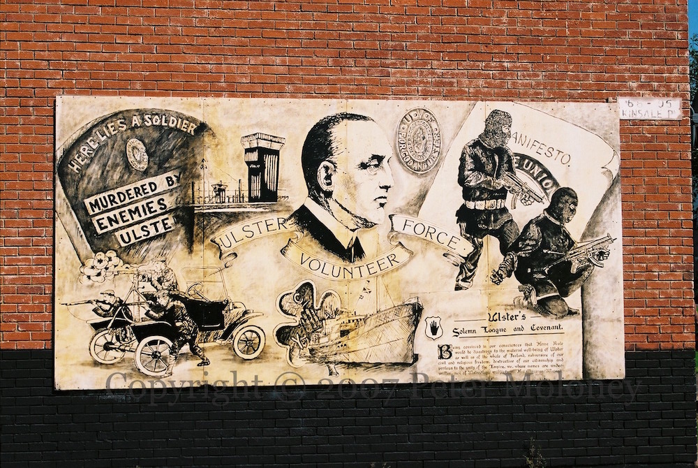 The title of the post comes from the previous location of this Ulster Volunteers/UVF board. The image above is from Seymour Gardens, Londonderry, but previously the board was on the main road (Sperrin Park) in the Caw with a black background and title-board above, and side-fence of insignia. From the period of the Ulster Volunteers, the board features the Carson, the Clyde Valley, the Covenant, and the UDU (Ulster Defence Union) manifesto of 1893.