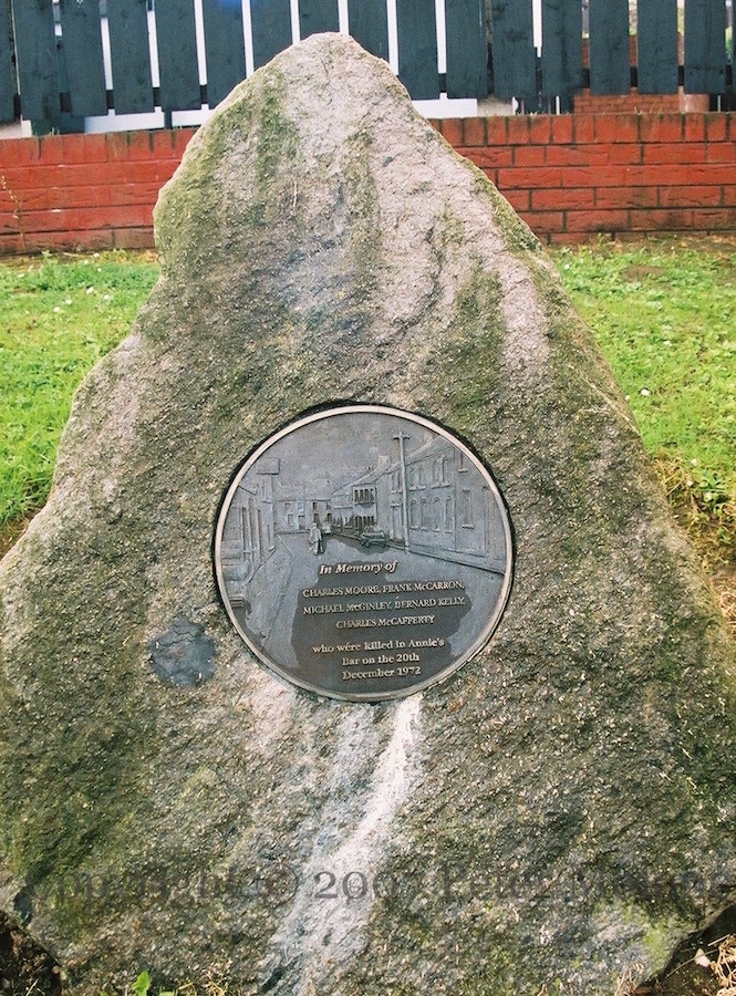 “In memory of Charles Moore, Frank McCarron, Michael McGinley, Bernard [“Barney”] Kelly, Charles McCafferty, who were killed in Annie’s Bar on the 20th December 1972.” The five were killed by two (allegedly) UDA gunmen as they watched soccer in the Top Of The Hill bar. For more, see Pat Finucane Centre.