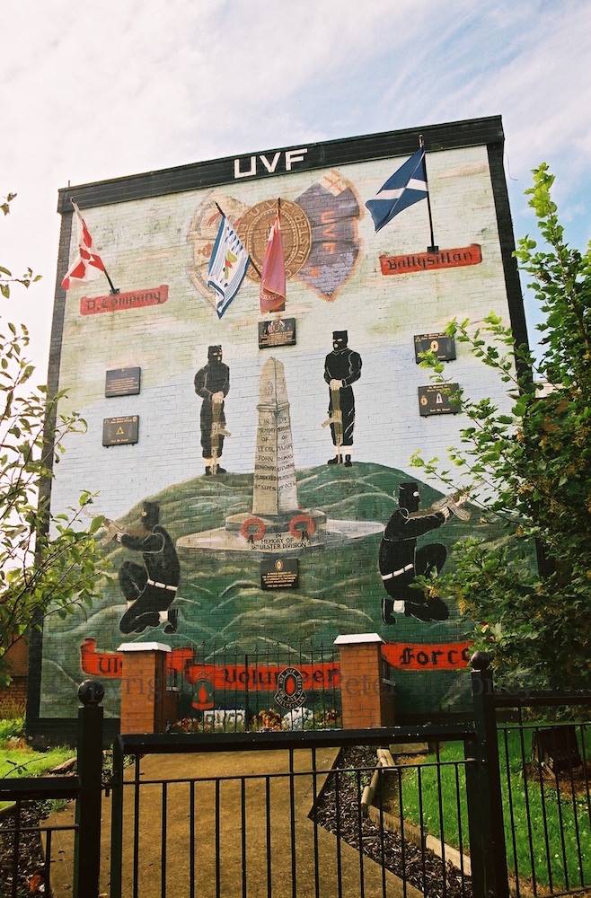 The memorial in the middle has now (compared to the original mural) been labelled (on a plinth) “In memory of 36th (Ulster) Division” but the names on the stone remain those of UVF volunteers John Bingham and Thomas Stewart.