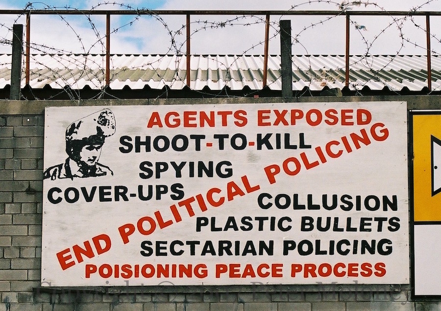 “End political policing: agents exposed – shoot-to-kill – spying – cover-ups –collusion – plastic bullets – sectarian policing – poisoning peace process”. Helmets with visors were used by the RUC during the 1980s, most memorably at the killing of Sean Downes (see Who Next?).