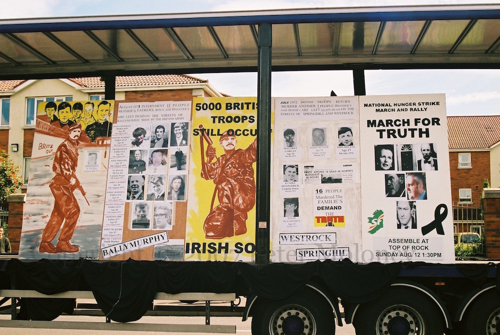 These images concern the 1971 Ballymurphy Massacre and the 1972 Springhill/Westrock Massacre. The demands for inquiries into the British Army killings were among the causes included in the March For Truth. The two painted boards on the lorry are by Mo Chara Kelly.