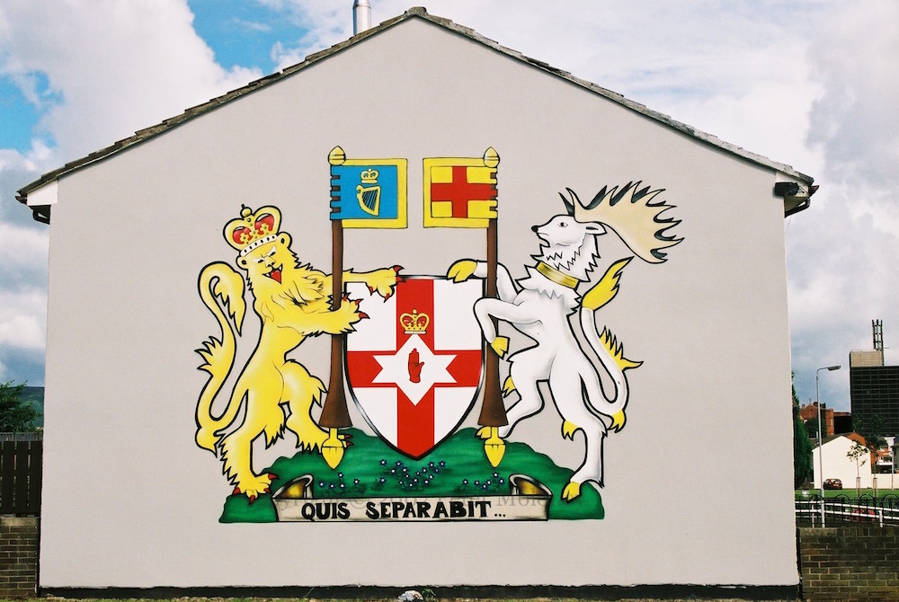 The Ulster Banner – the flag of the Northern Ireland government from 1924 to 1973 – is taken from the arms, shown here. The supporters are a lion – for the Ulster-Scots – and an elk – for the Irish (WP).