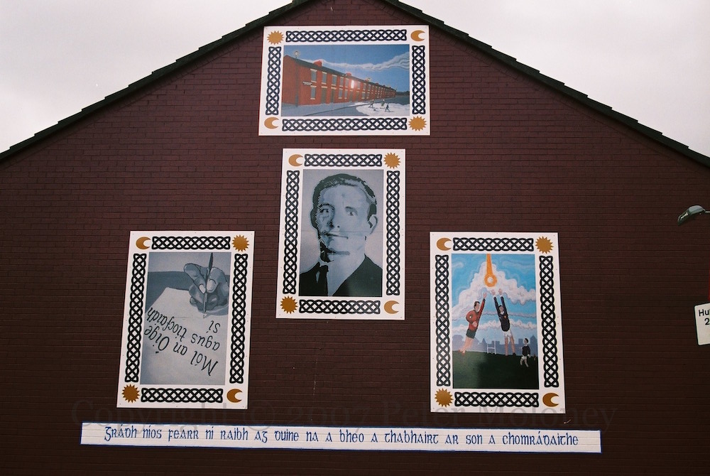 IRA Volunteer Sean Martin is at the centre of these panels in Beechfield Street, in the Short Strand, Belfast. The image in the apex of the house depicts his death in nearby Anderson Street (which no longer exists; roughly where Arran Street is). milltowncemetery.com (link now dead) reports that Sean Martin “was killed in April 1940 during a lecture on arms and a Millis hand grenade in a small terrace house in Anderson Street. In the course of the lecture Sean, who was giving the instruction, had dismantled the grenade, and was putting it together again. The detonator which he was using was thought to have been a dud one. In demonstrating how to throw the grenade, he pulled out the pin and released the lever. Hearing the hissing sound of the fuse he realised that the detonator was live and that the grenade was about to explode. He rushed to the window with the intention of throwing it out on to the street, but some children were playing outside. In the few seconds left to him, Sean had to make that terrible choice; shouting to the others to get out of the house – he pulled the grenade into himself with his two hands and leaned over the kitchen table with the grenade covered by his whole body. The device exploded and blew him right across the kitchen, killing him instantly. All the others escaped uninjured.” The Irish at the bottom reads “Grádh níos fearr ní raıbh ag duıne na a bheo a thabhaırt ar son a chomrádaıthe” – a translation of John 15:13.