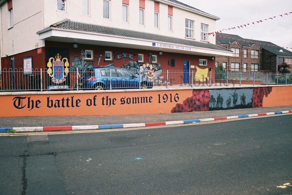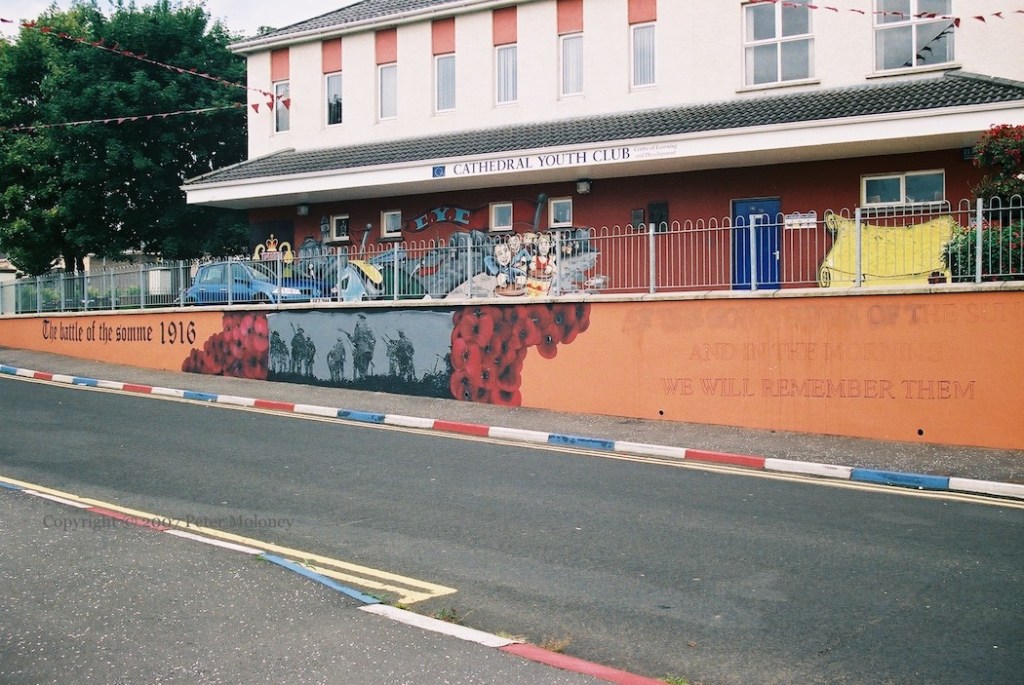 The UDA mural on the left of the youth club is to Sgt Lindsay Mooney.
