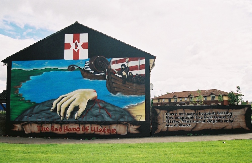 “There are many legends telling the origins of the Red Hand Of Ulster. This mural depicts only one of those.” In this case, the myth is that Ulster was offered as a prize to whoever could reach it first and was won by throwing a severed hand onto the shore.
