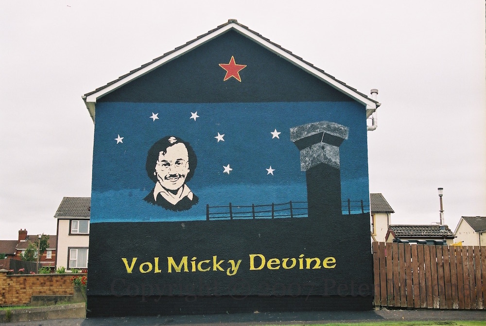 Michael “Mickey” (though here “Micky”) Devine was a founder member of the Irish Republican Socialist Party (IRSP) in his native Derry (The Plough & The Stars) and also of the INLA (IRSP Derry). The mural on the gable shown above includes the socialist symbols of the red star and the plough, great bear (ursa major), or “big dipper” shining over the towers of Long Kesh, where Devine died on the 21st of August, 1981, after 60 days on hunger strike, the tenth and final striker to die.