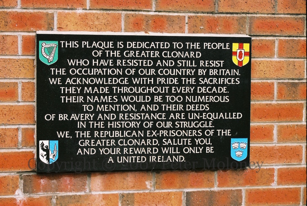 “This plaque is dedicated to the people of the greater Clonard who have resisted and still resist the occupation of our country by Britain. We acknowledge with pride the sacrifices they made throughout every decade. Their names would be too numerous to mention, and their deeds of bravery and resistance are un-equalled in the history of our struggle. We, the republican ex-prisoners of the greater Clonard, salute you, and your reward will only be a united Ireland.” This is the plaque in the left-hand third of the Clonard memorial garden.