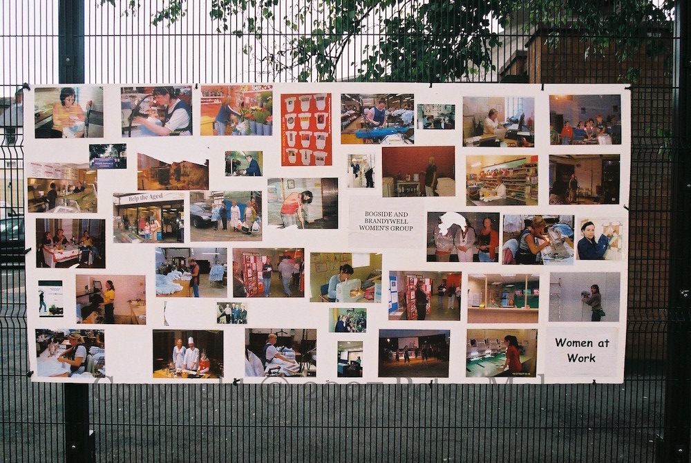 These two boards are on the fence outside the Pilot’s Row Centre in Rossville Street. The first is a Bogside & Brandywell Women’s Group compilation of women in various occupations (plus Bernadette Devlin breaking up pavement); the second shows support for Catalonia: “300 years of occupation, 300 years of resistance”.